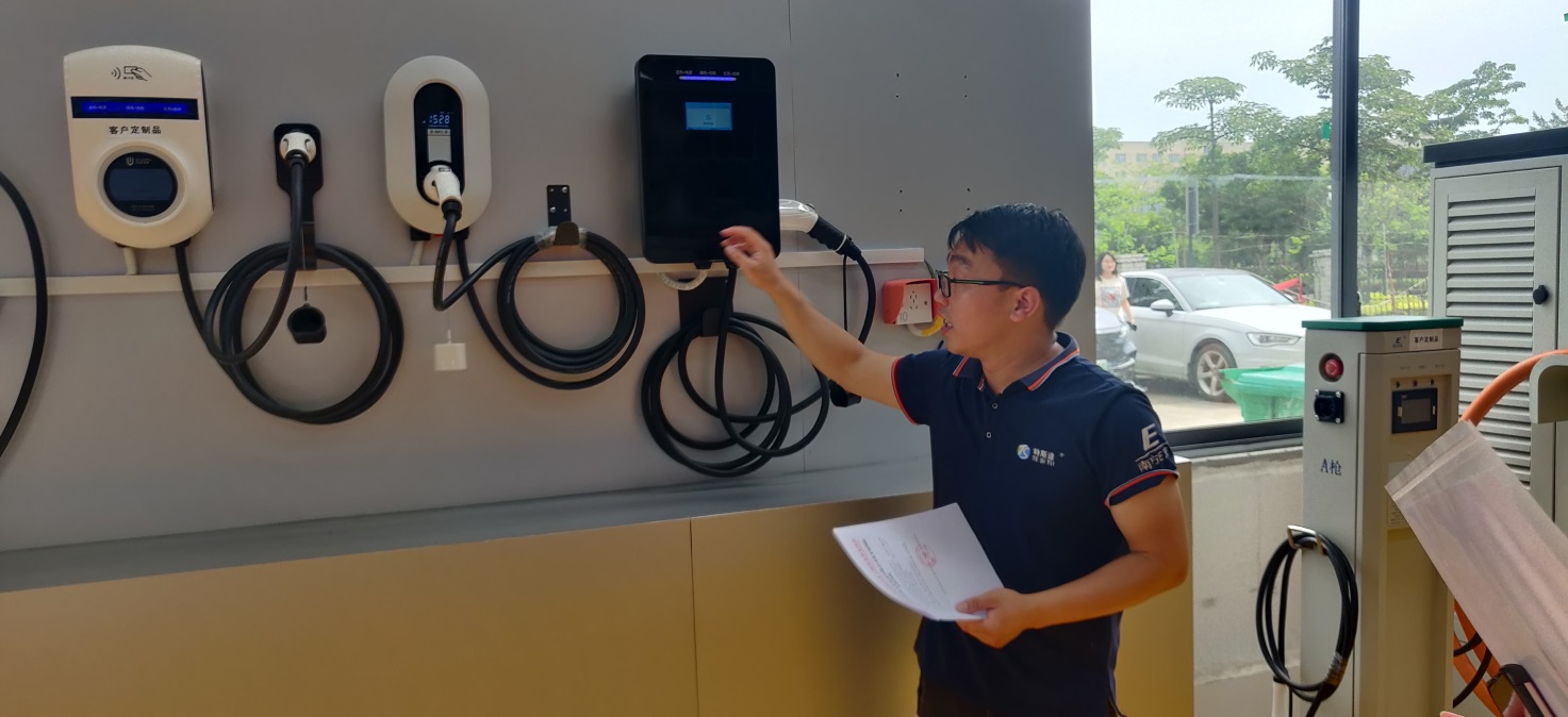 特斯图公司韦荏文同志正在介绍新能源汽车充电桩