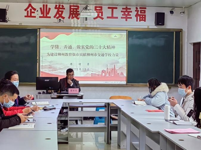 党委书记廖增勇以《学懂、弄通、做实党的二十大精神为建设柳州教育强市贡献柳州市交通学校力量》为主题给与会同志上了一堂生动的党课。廖增勇同志讲到要准确把握教育、科技、人才“三位一体”统筹部署的战略意义,这既凸显了战略性考量,又强化了基础性地位,更深化了规律性认识。同时,他指出,学时先导,应该学懂弄通党的二十大精神内涵,深刻把握立场观点方法,加深自己的思想认识,全面落实决策部署的要求。随后,张匡闽、谢越峰同志做了学习分享发言。