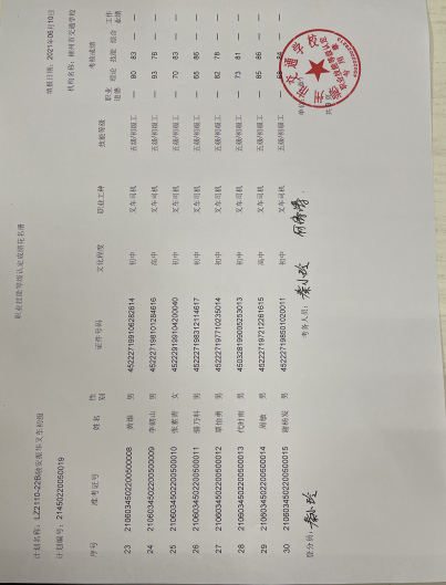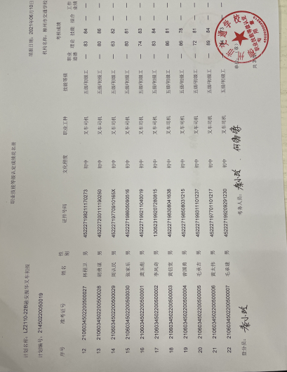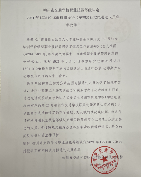 柳州市交通学校职业技能等级认定2021年第二十二批柳州振华叉车初级认定拟通过人员名单公示