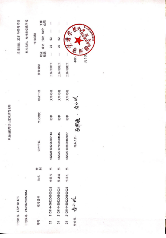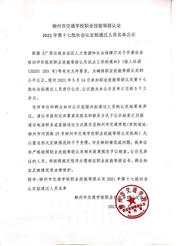 柳州市交通学校职业技能等级认定2021年第十七期叉车初级认定拟通过人员名单公示