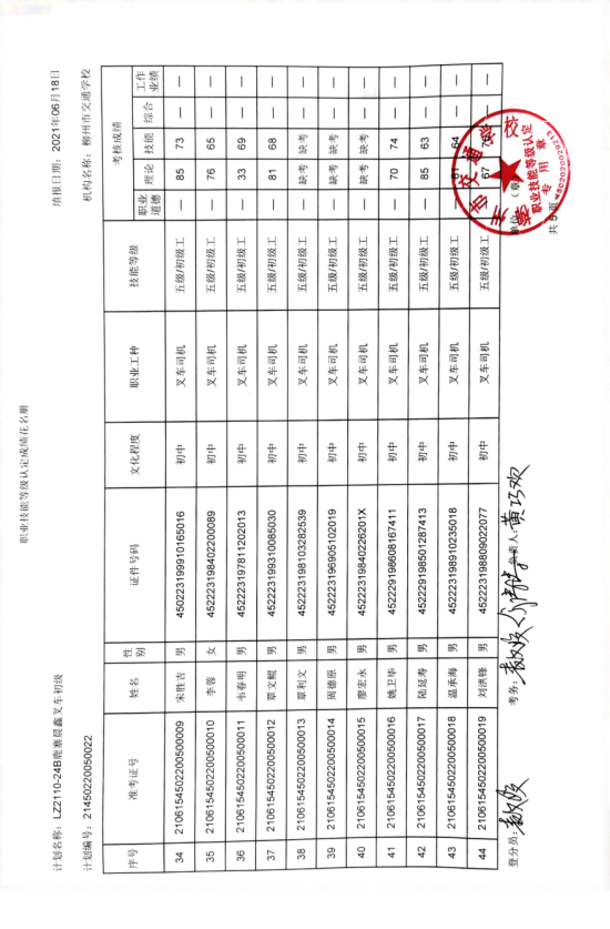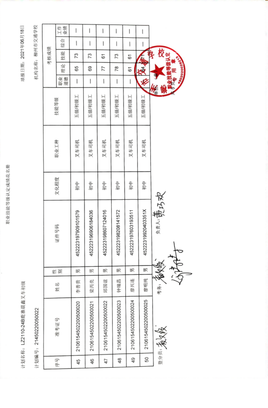 柳州市交通学校2021年LZ2110-24B鹿寨晨鑫叉车初级认定拟通过人员名单公示