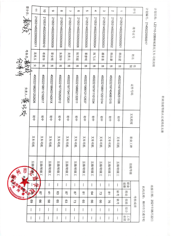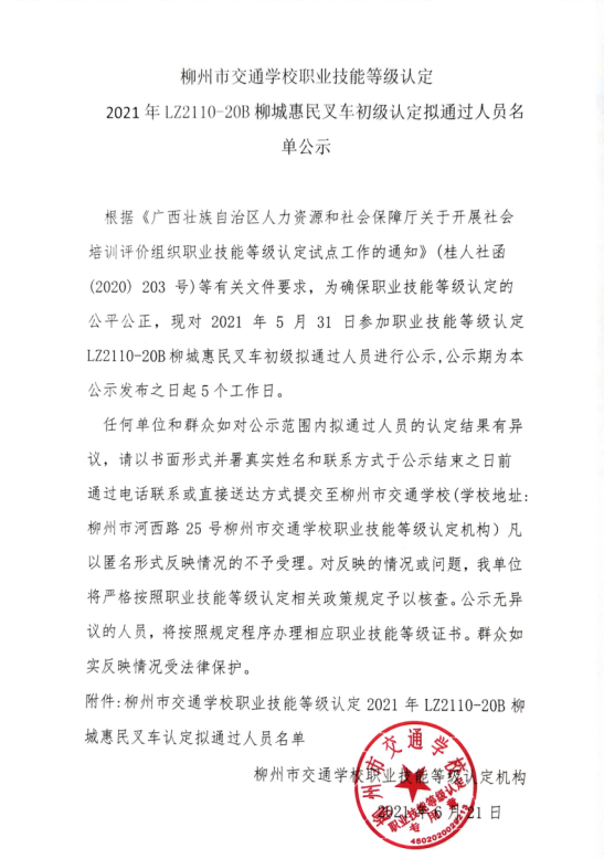 柳州市交通学校职业技能等级认定2021年LZ110-20B柳城惠民叉车初级认定拟通过人员名单公示