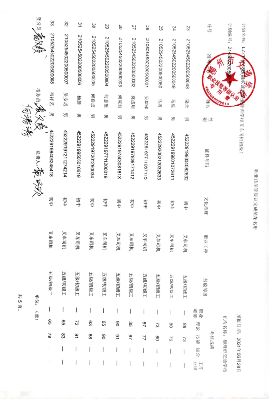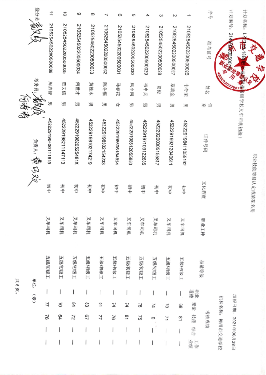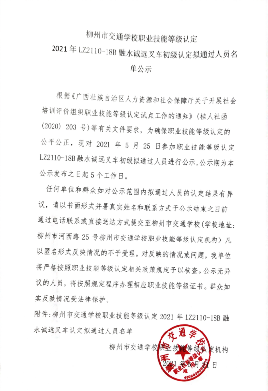 柳州市交通学校职业技能等级认定2021年LZ2110-18B融水诚远叉车初级认定拟通过人员名单公示