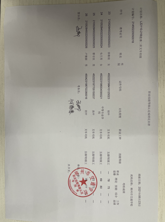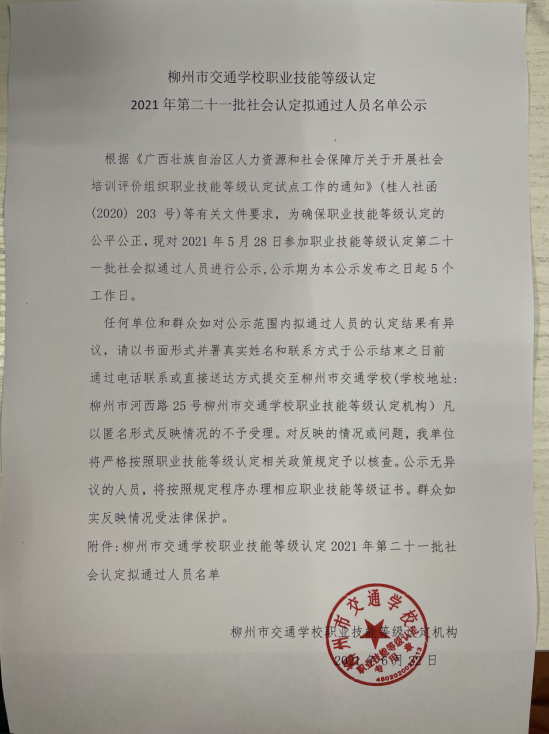 柳州市交通学校职业技能等级认定2021年第二十一期叉车初级认定拟通过人员名单公示