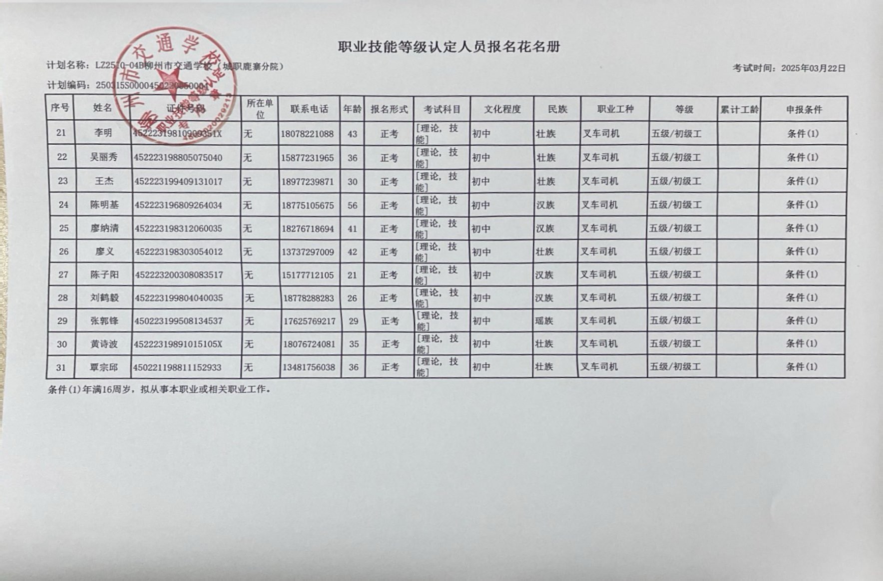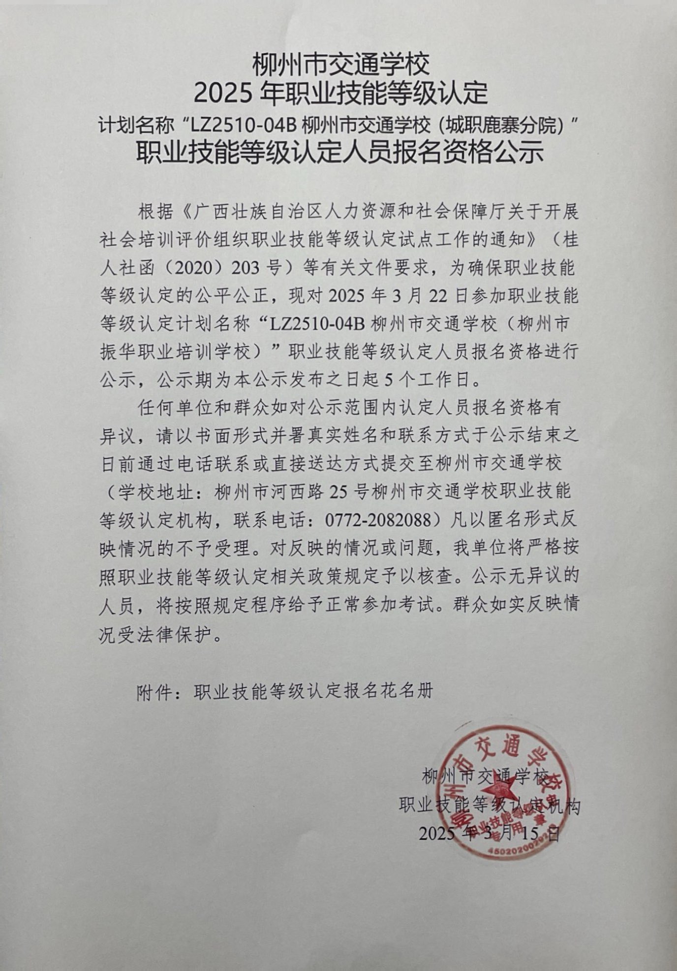 柳州巿交通学校2025年职业技能等级认定计划名称“LZ2510-04B柳州市交通学校(城职鹿寨分院)”职业技能等级认定人员报名资格公示