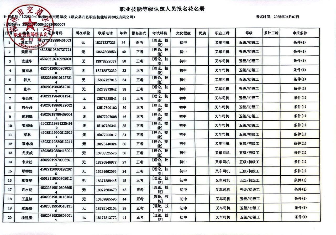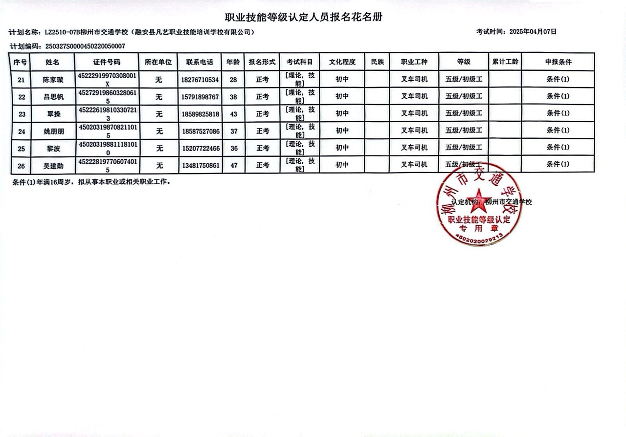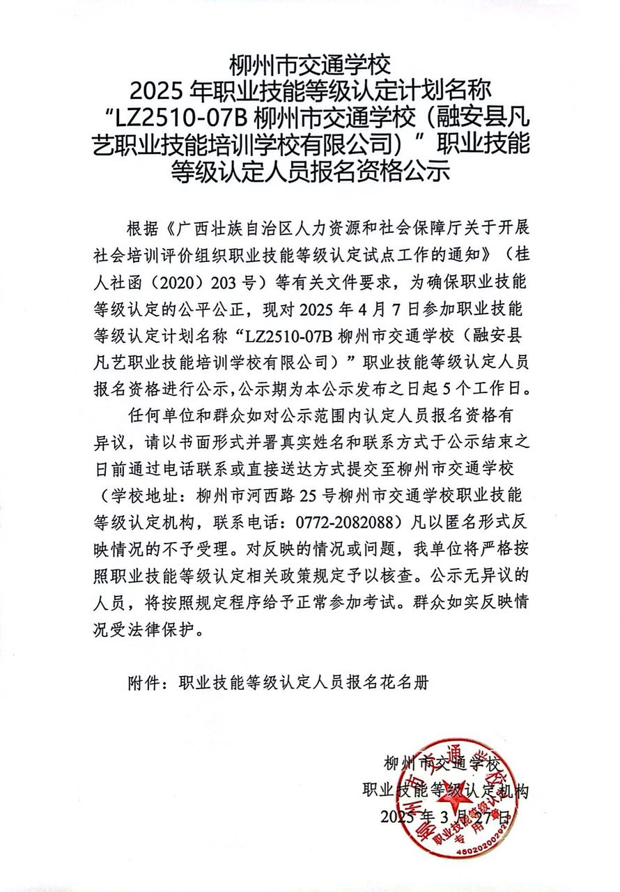 柳州巿交通学校 2025年职业技能等级认定计划名称“LZ2510-07B柳州市交通学校(融安县凡艺职业技能培训学校有限公司)”职业技能等级认定人员报名资格公示