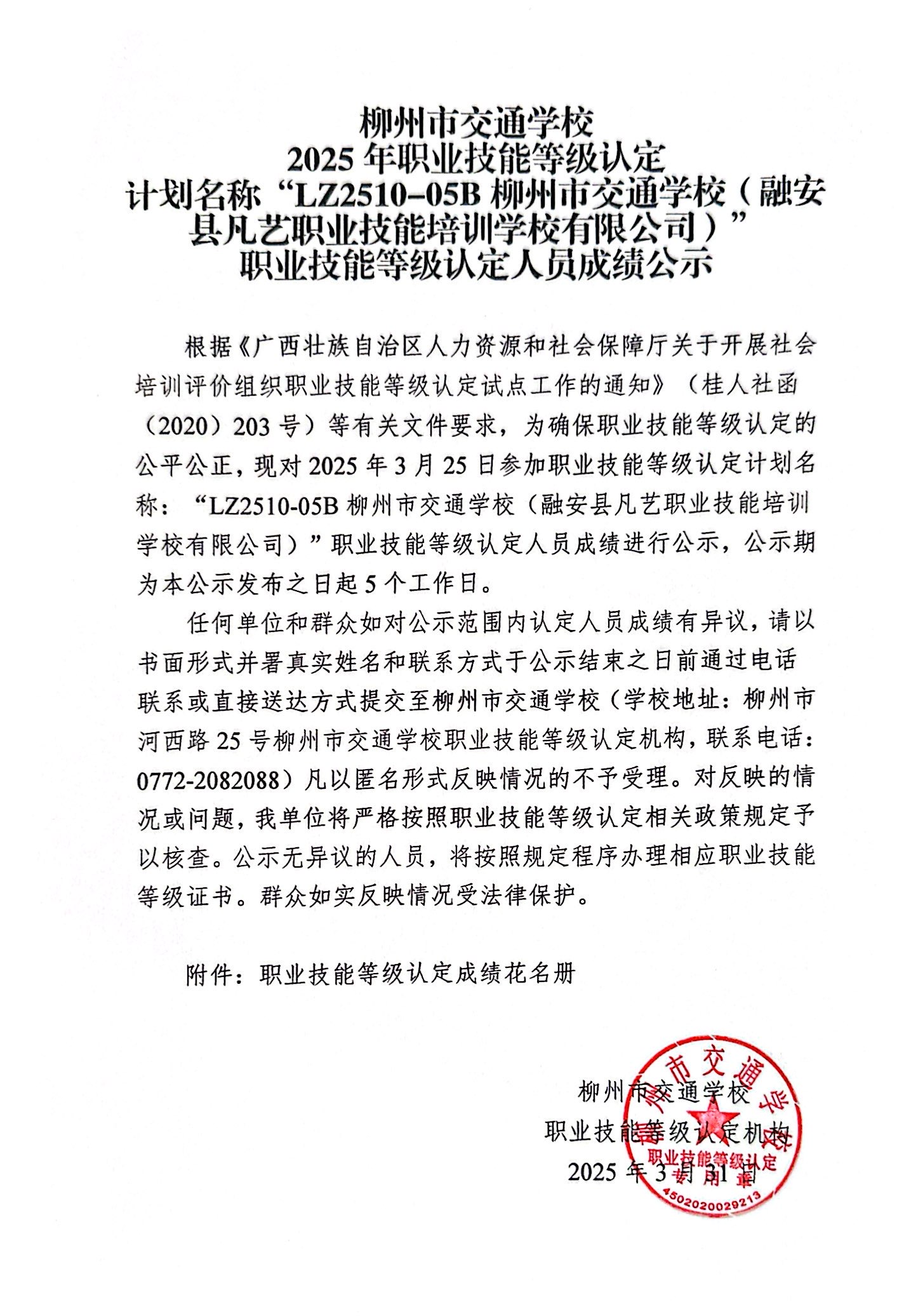 柳州市交通学校2025年职业技能等级认定计划名称“LZ2510-05B柳州市交通学校(融安县凡艺职业技能培训学校有限公司)”职业技能等级认定人员成绩公示