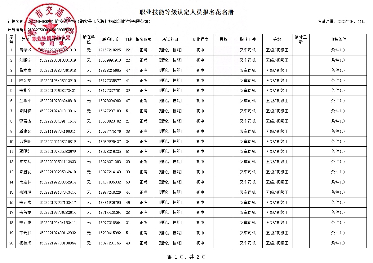 柳州巿交通学校2025年职业技能等级认定计划名称“LZ2510-08B柳州市交通学校(融安县凡艺职业技能培训学校有限公司)” 职业技能等级认定人员报名资格公示