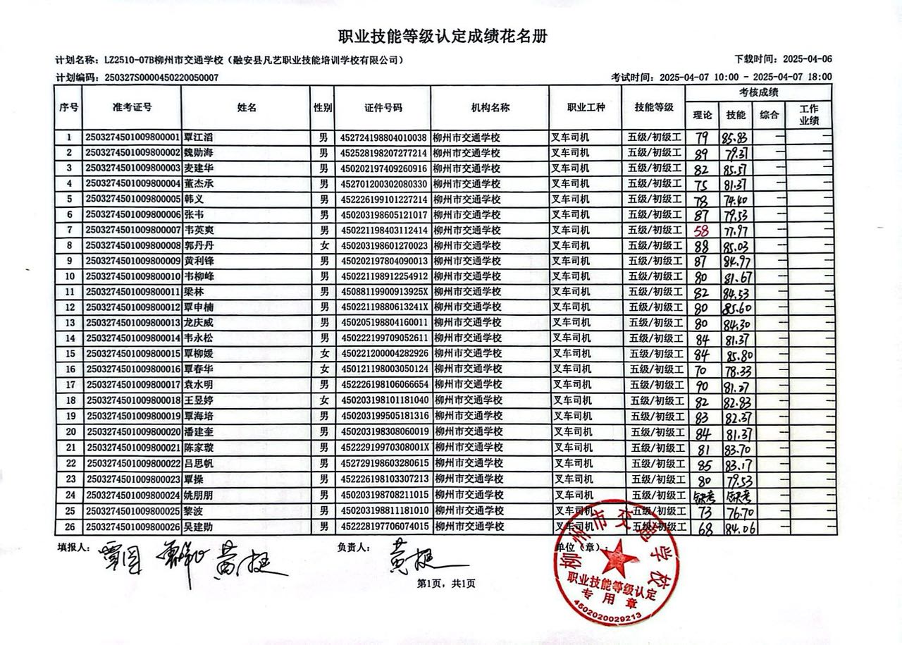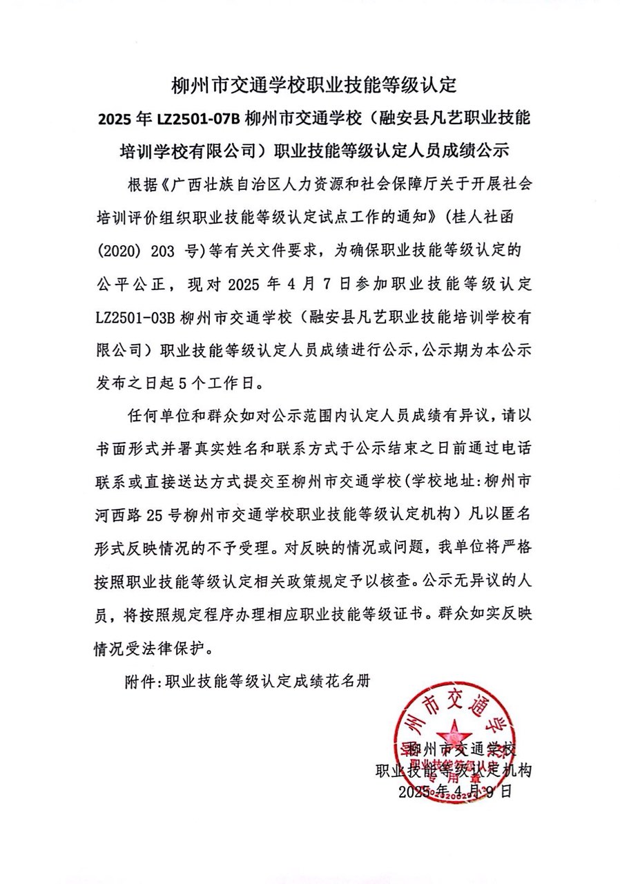 柳州市交通学校职业技能等级认定 2025年LZ2501-07B柳州市交通学校(融安县凡艺职业技能培训学校有限公司)职业技能等级认定人员成绩公示