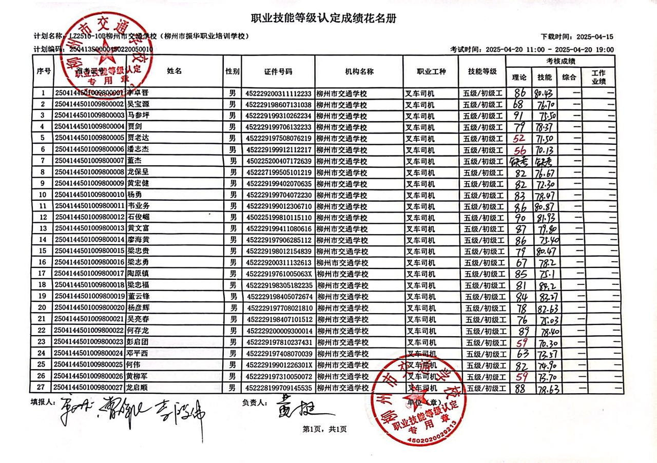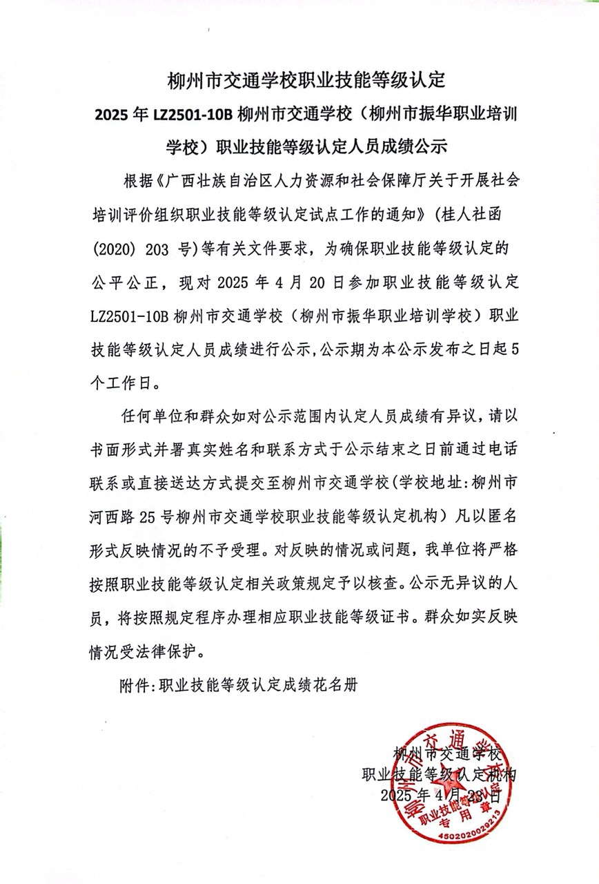 柳州市交通学校职业技能等级认定 2025年LZ2501-10B柳州市交通学校(柳州市振华职业培训学校)职业技能等级认定人员成绩公示