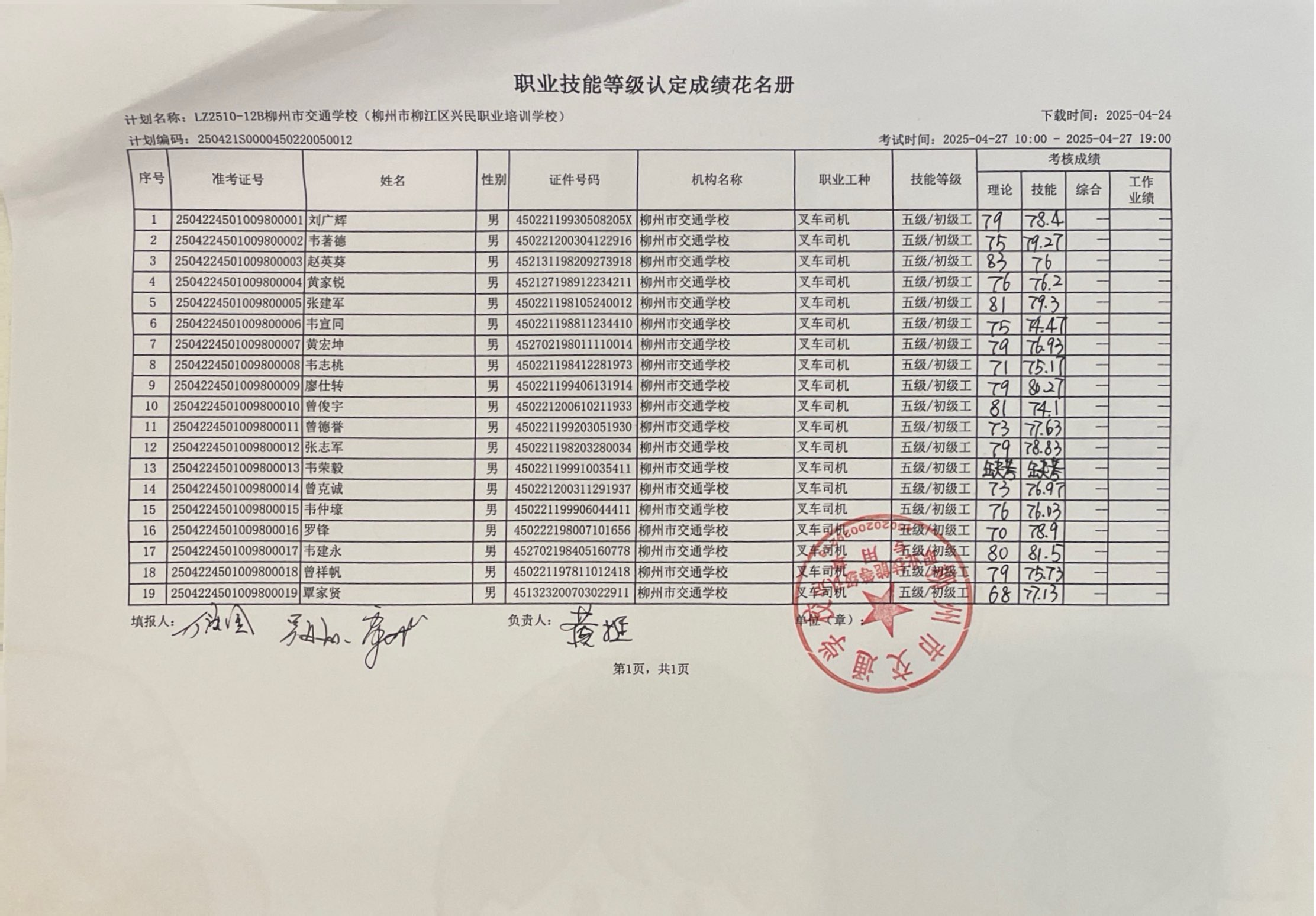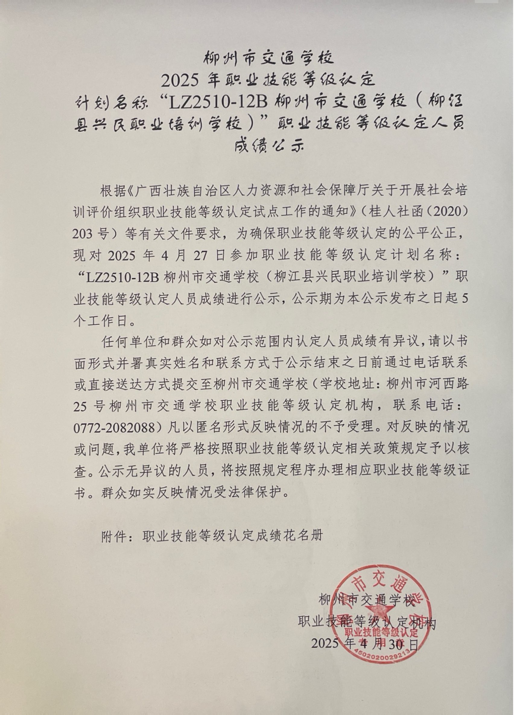 柳州市交通学校 2025年职业技能等级认定 计划名称“LZ2510-12B柳州市交通学校(柳江县兴民职业培训学校)”职业技能等级认定人员成绩公示