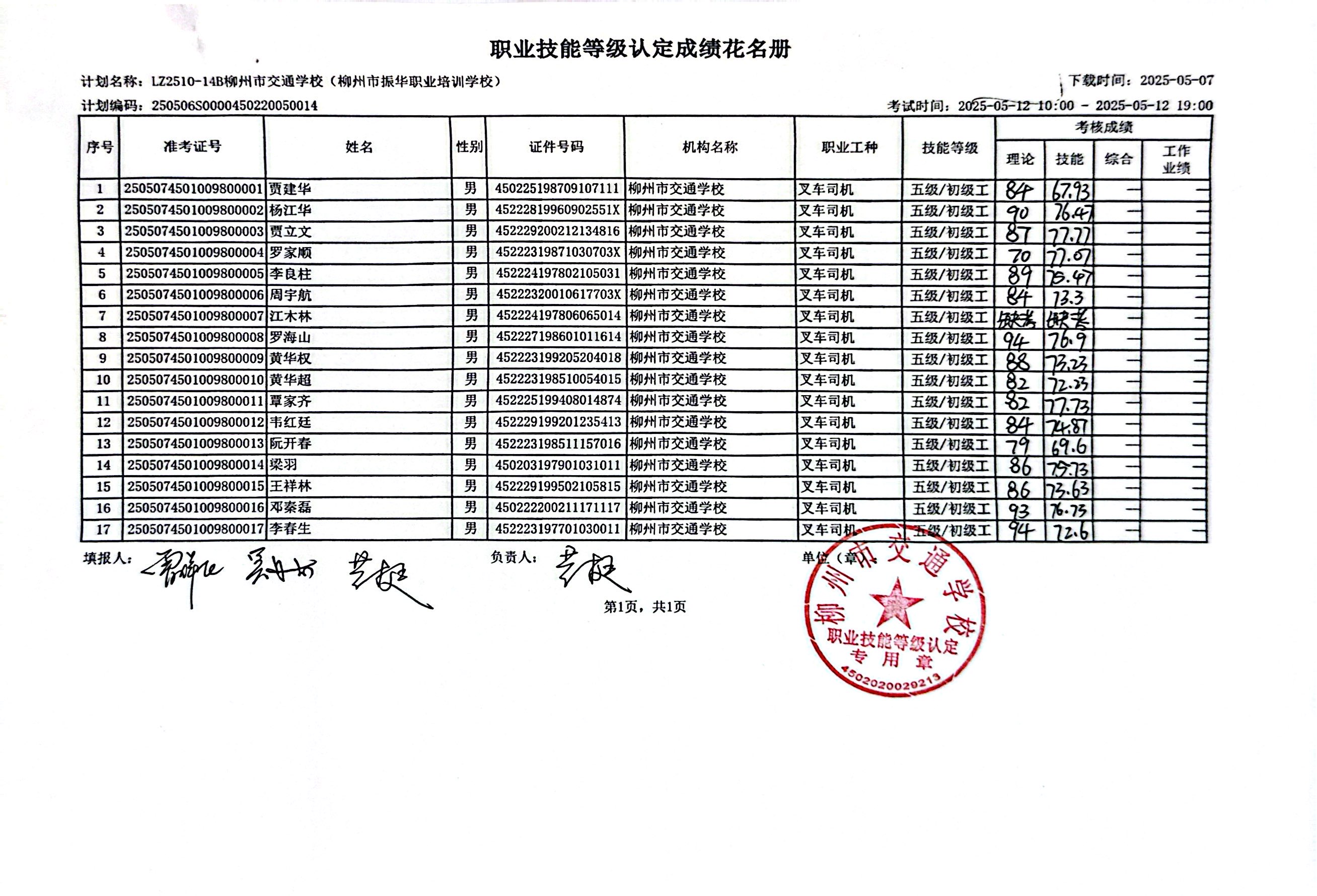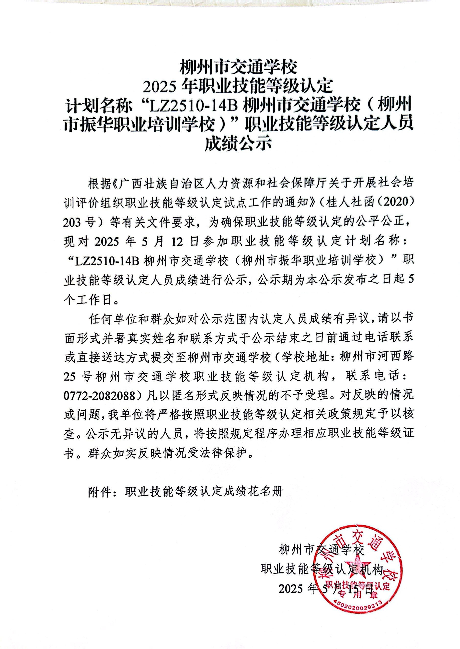 柳州巿交通学校2025年职业技能等级认定计划名称“LZ2510-014B柳州市交通学校(柳州市振华职业培训学校)”职业技能等级认定人员成绩公示