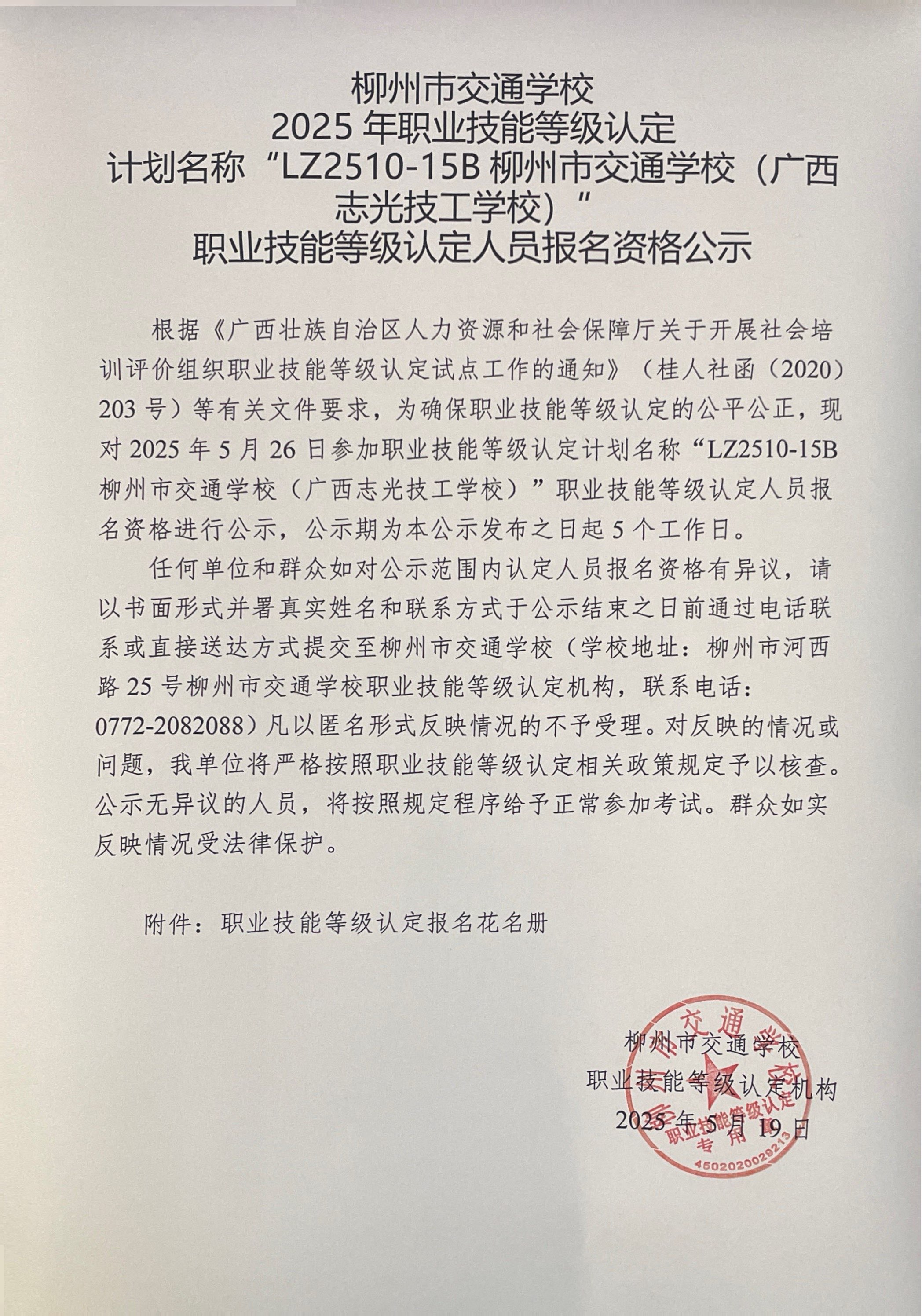 柳州巿交通学校 2025年职业技能等级认定 计划名称“LZ2510-15B柳州市交通学校(广西志光技工学校)” 职业技能等级认定人员报名资格公示