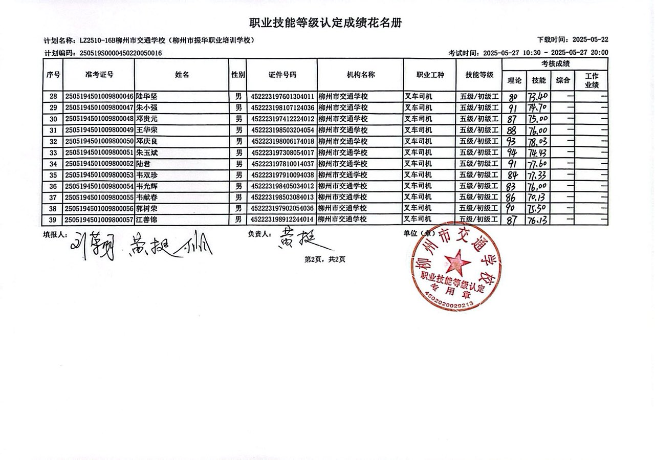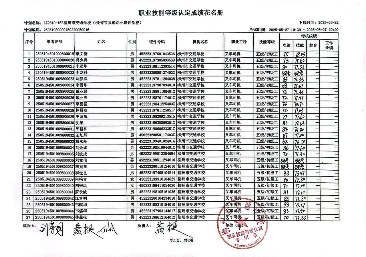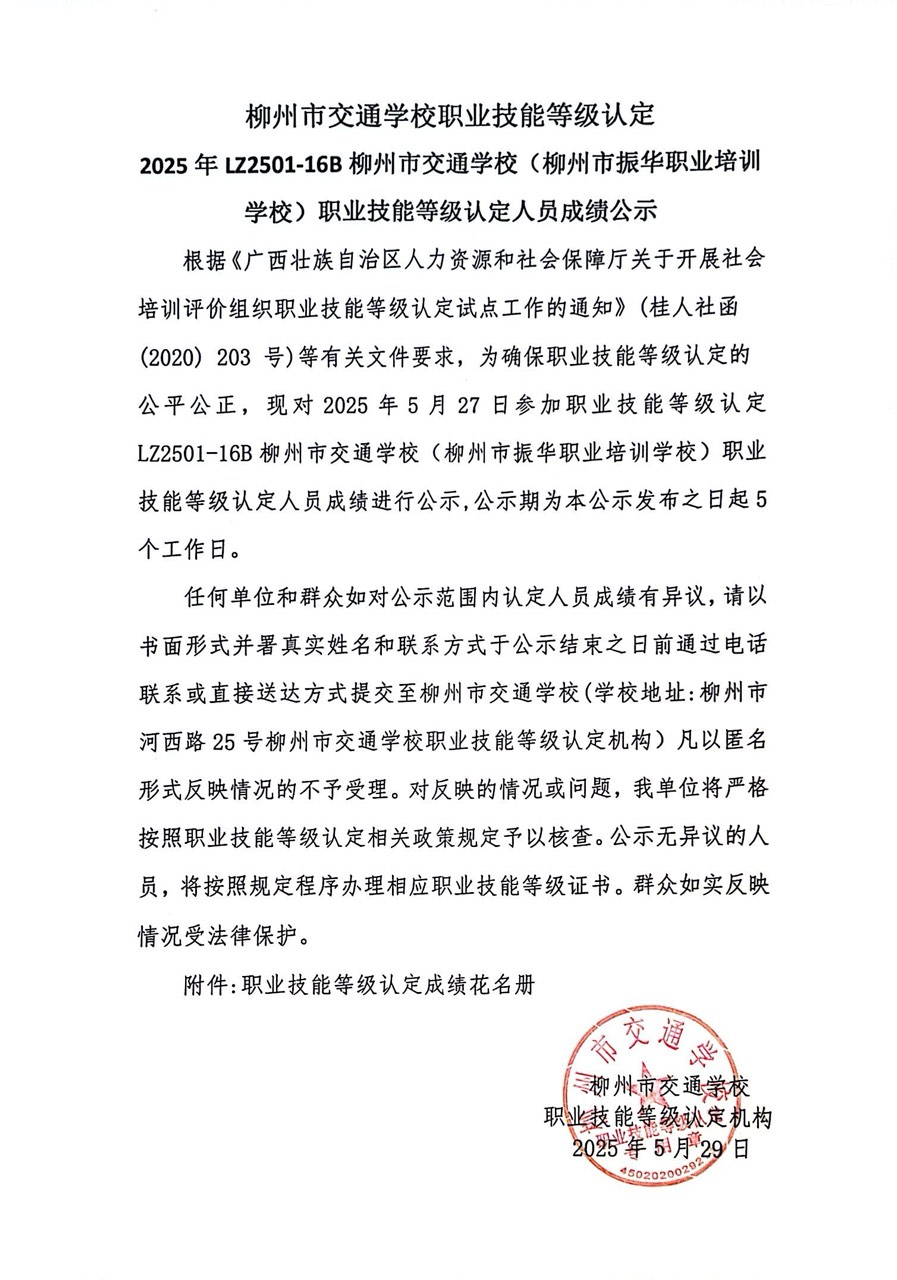 柳州市交通学校职业技能等级认定 2025年LZ2501-16B柳州市交通学校(柳州市振华职业培训学校)职业技能等级认定人员成绩公示