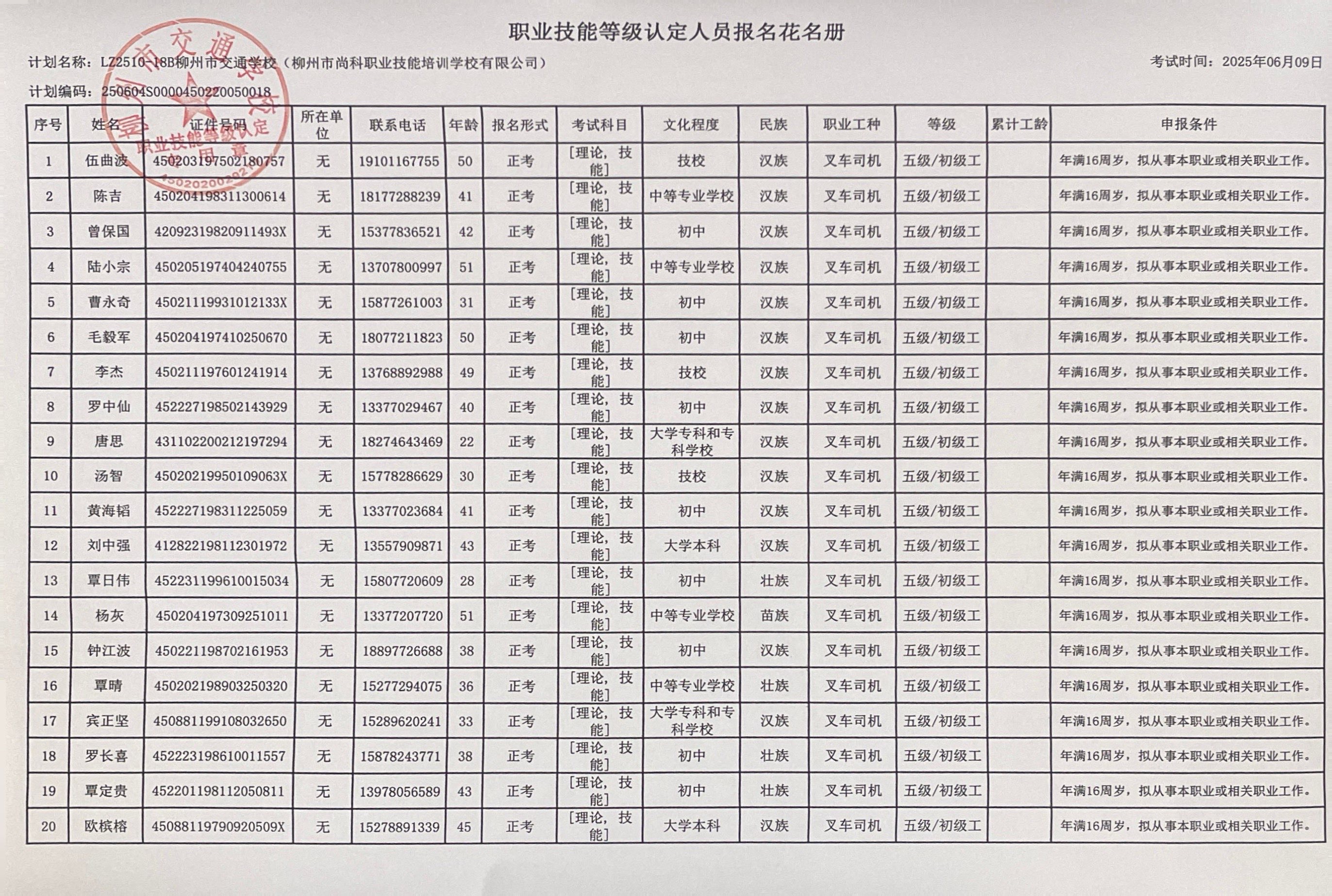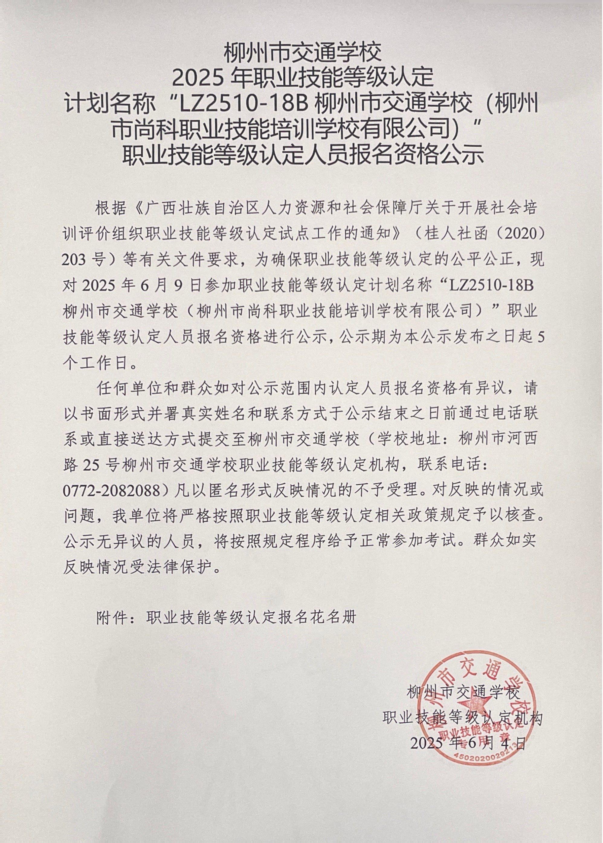 柳州巿交通学校 2025年职业技能等级认定 计划名称“LZ2510-18B柳州市交通学校(柳州市尚科职业技能培训学校有限公司)” 职业技能等级认定人员报名资格公示