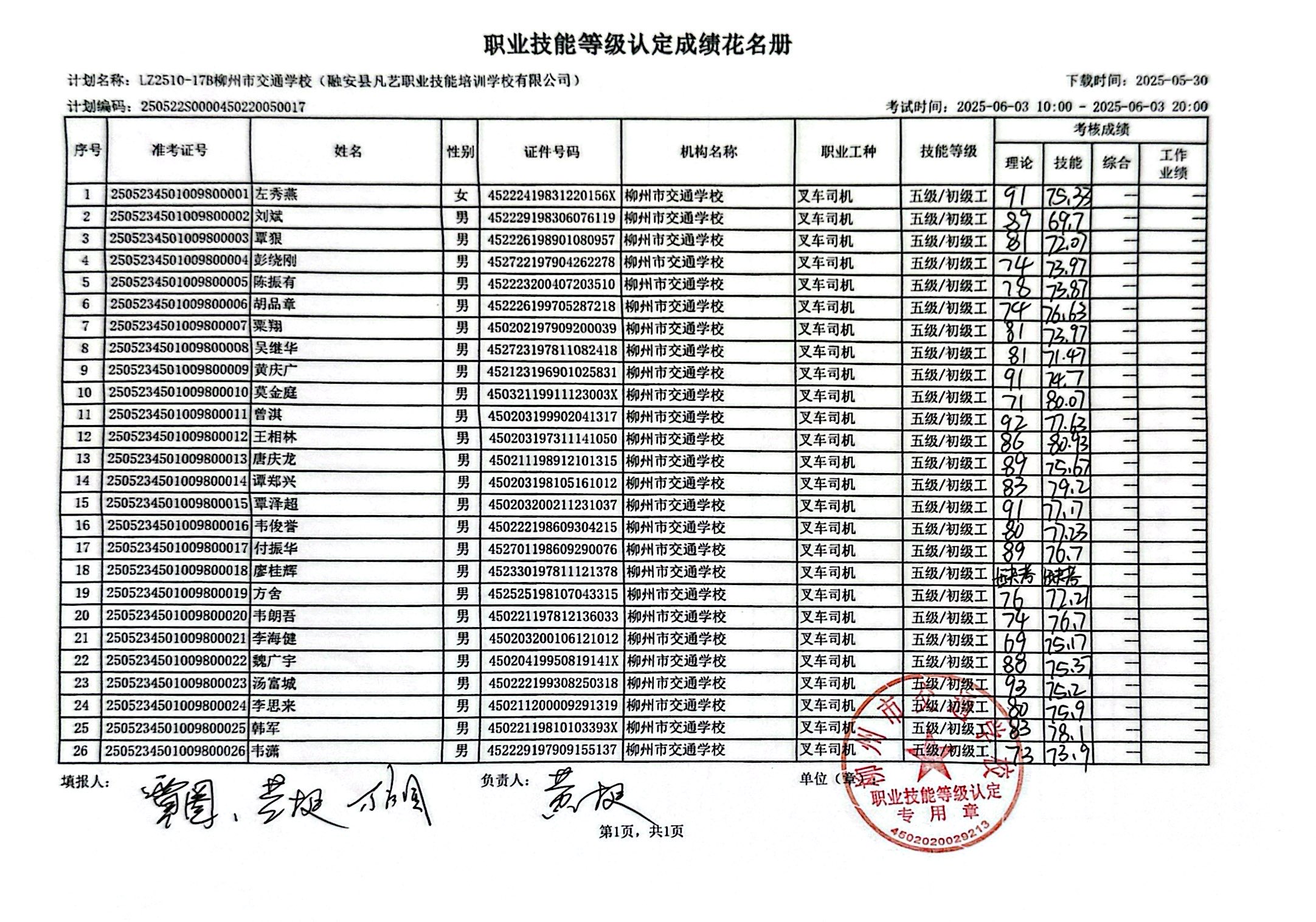 拟公开信息 柳州巿交通学校2025年职业技能等级认定计划名称“LZ2510-17B柳州市交通学校(融安县凡艺职业技能培训学校有限公司)” 职业技能等级认定人员成绩公示