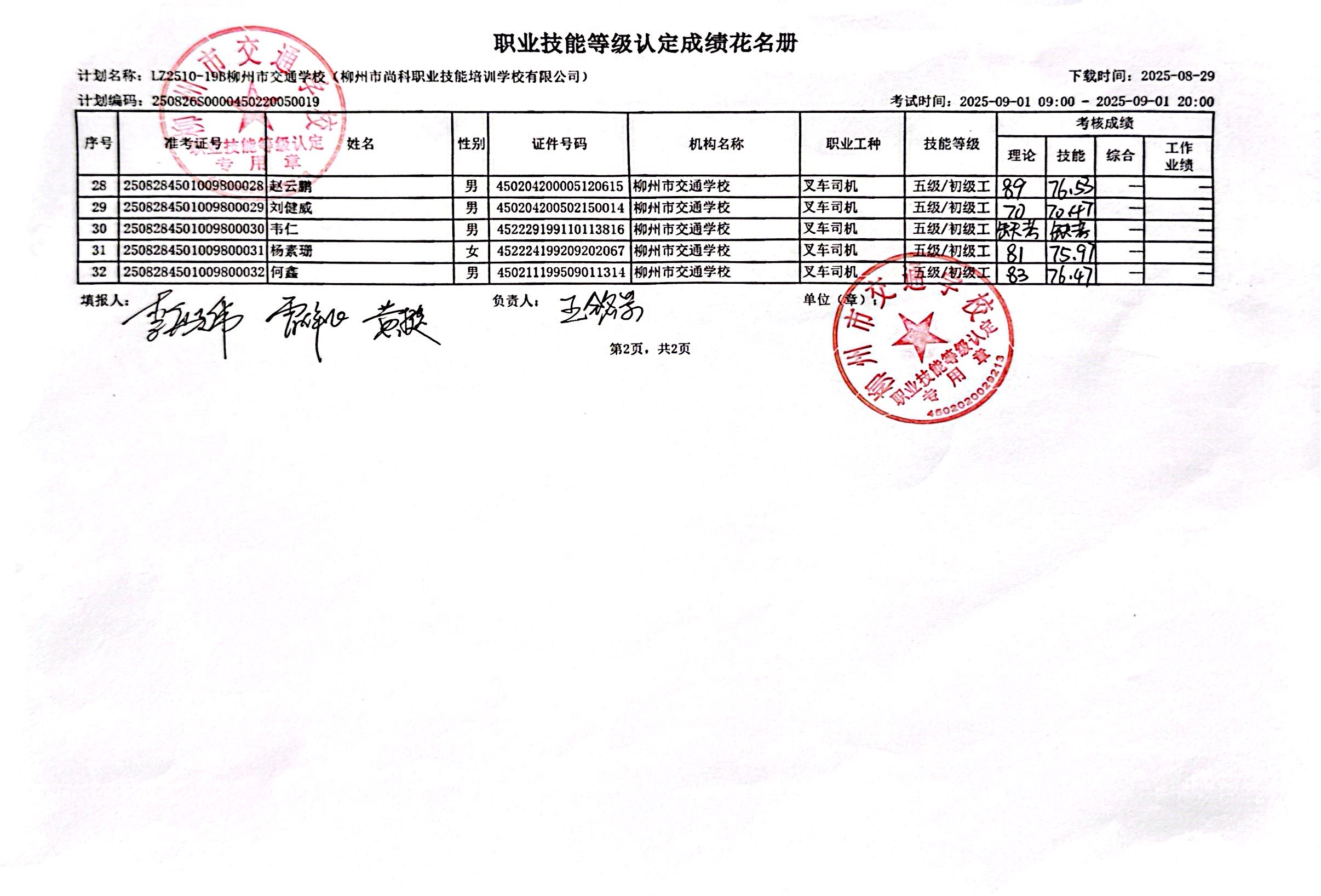 柳州市交通学校2025年职业技能等级认定计划名称“LZ2510-19B柳州市交通学校(柳州市尚科职业技能培训学校有限公司)”职业技能等级认定人员成绩公示