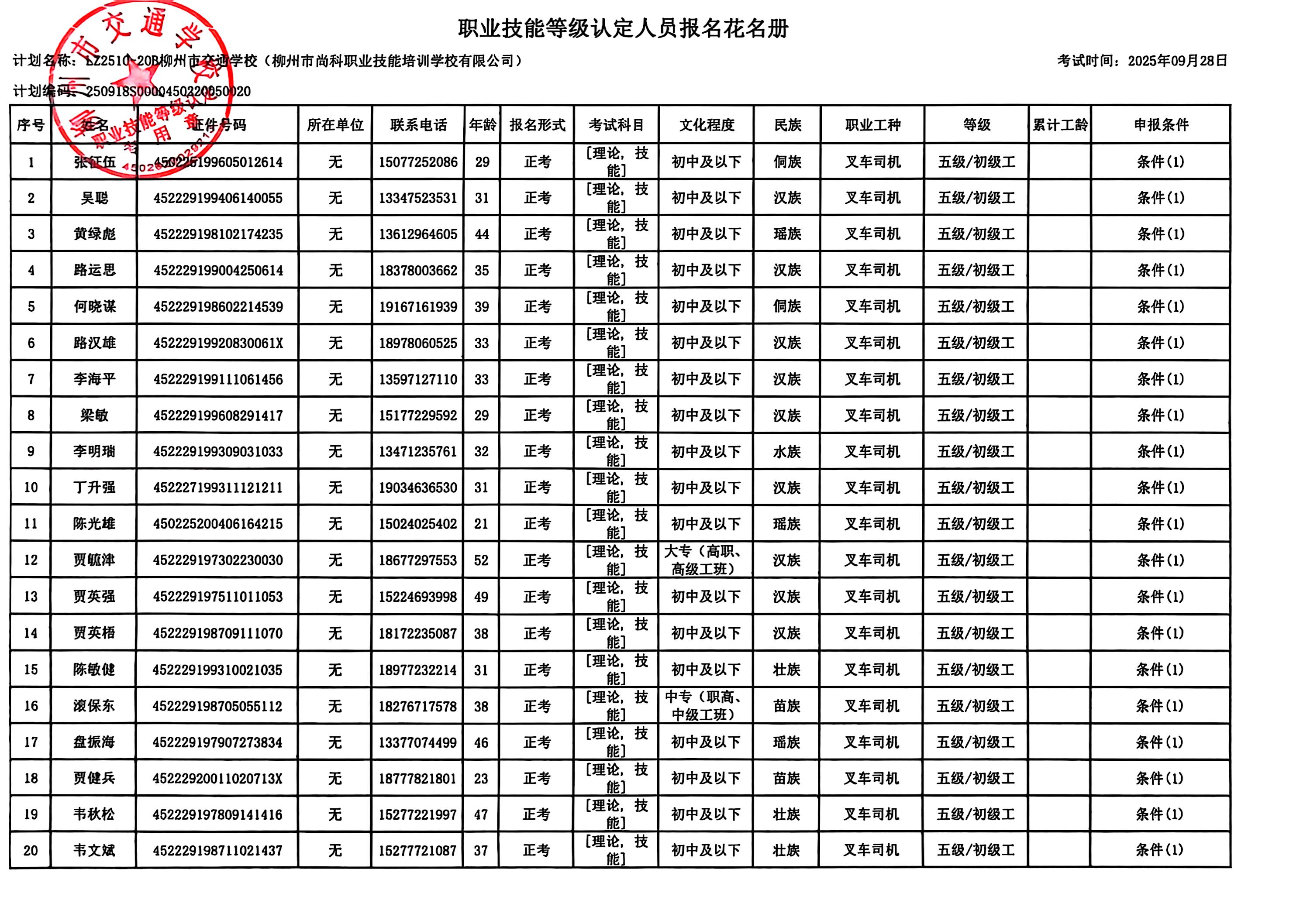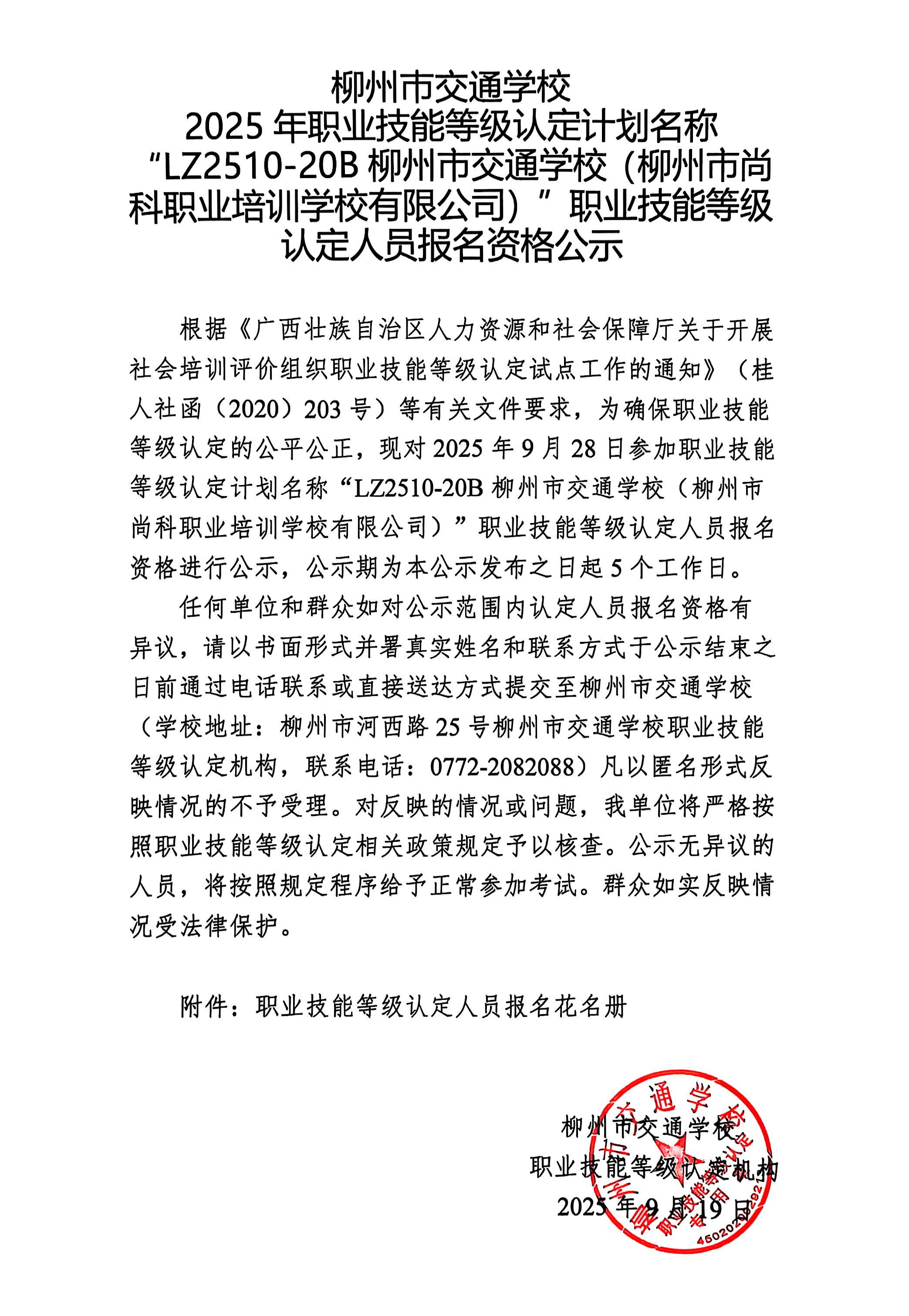 柳州巿交通学校2025年职业技能等级认定计划名称“LZ2510-20B柳州市交通学校(柳州市尚科职业培训学校有限公司)”职业技能等级认定人员报名资格公示