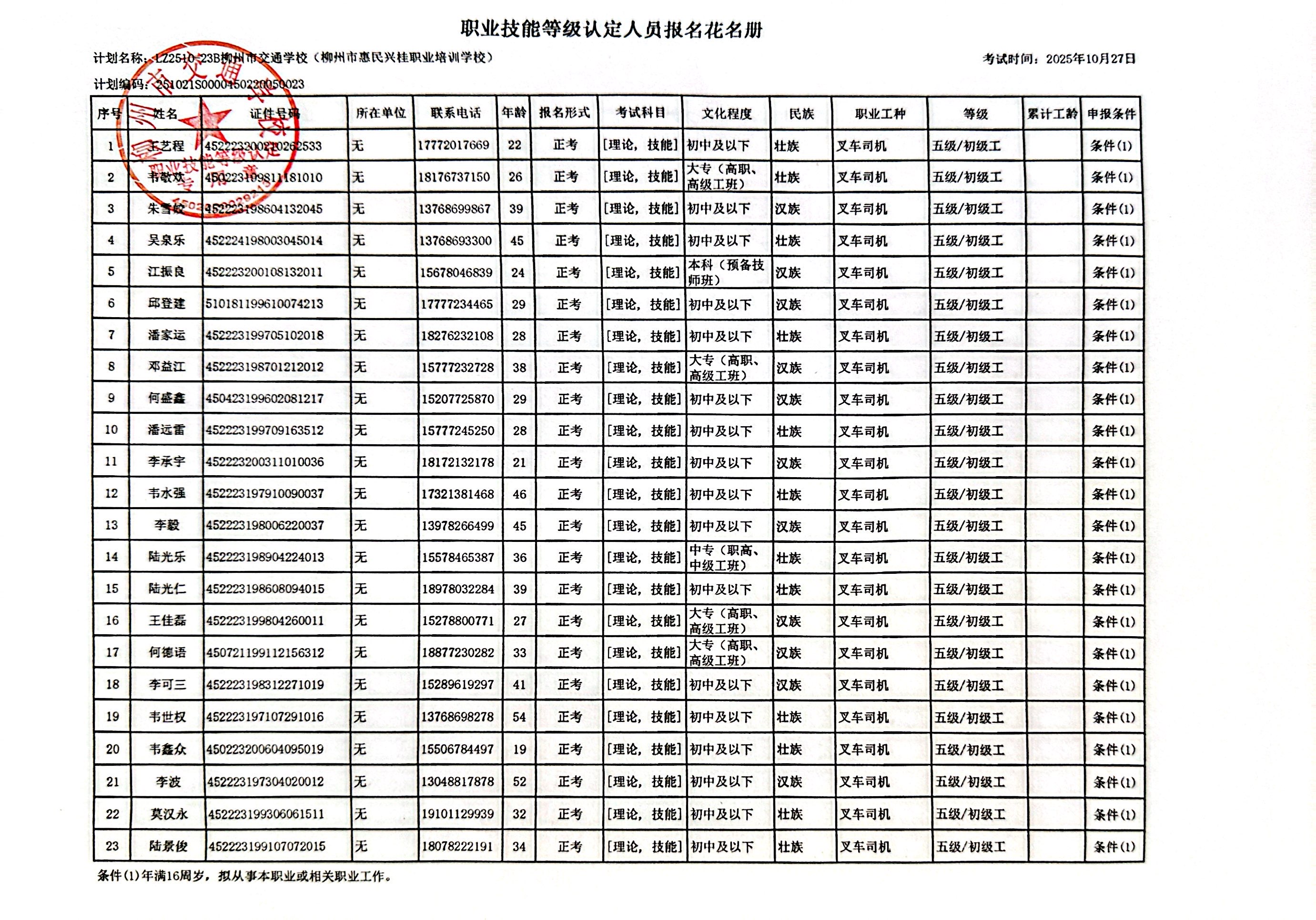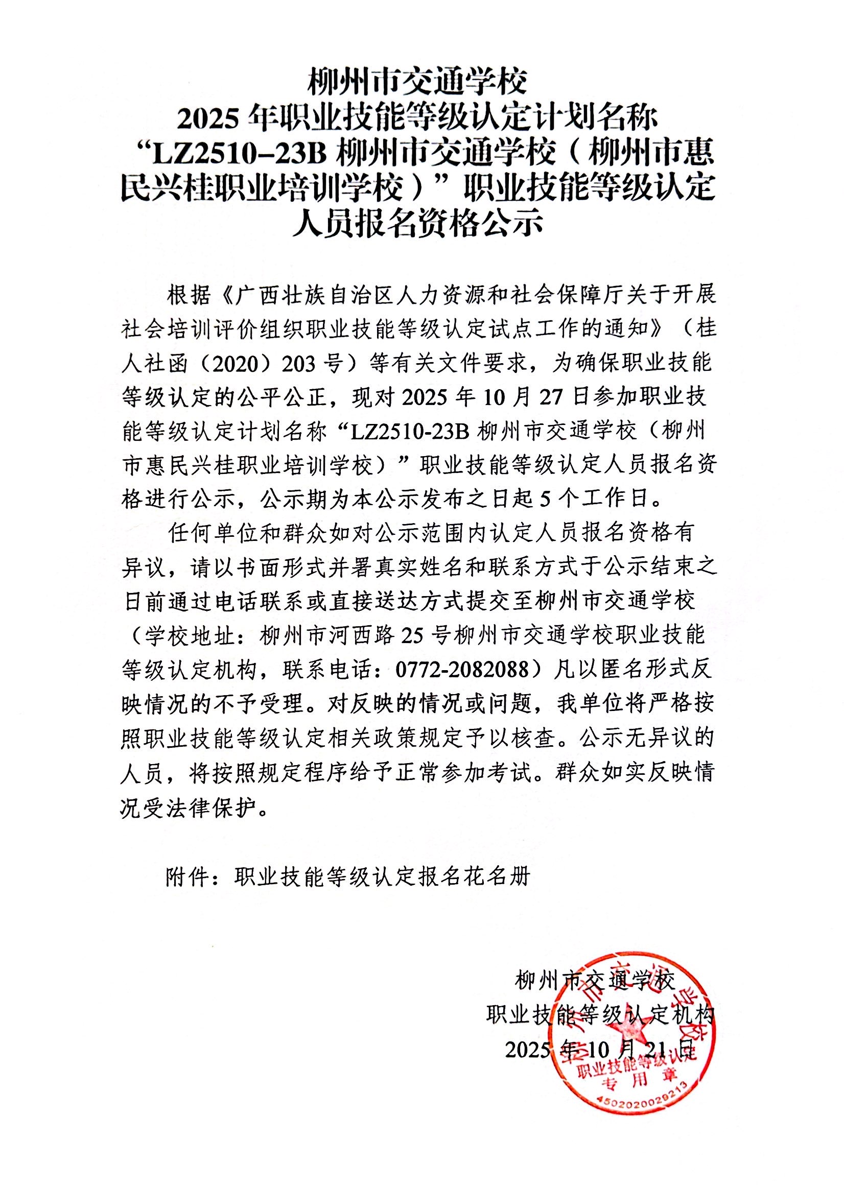 柳州巿交通学校2025年职业技能等级认定计划名称“LZ2510-23B柳州市交通学校(柳州市惠民兴桂职业培训学校)”职业技能等级认定人员报名资格公示