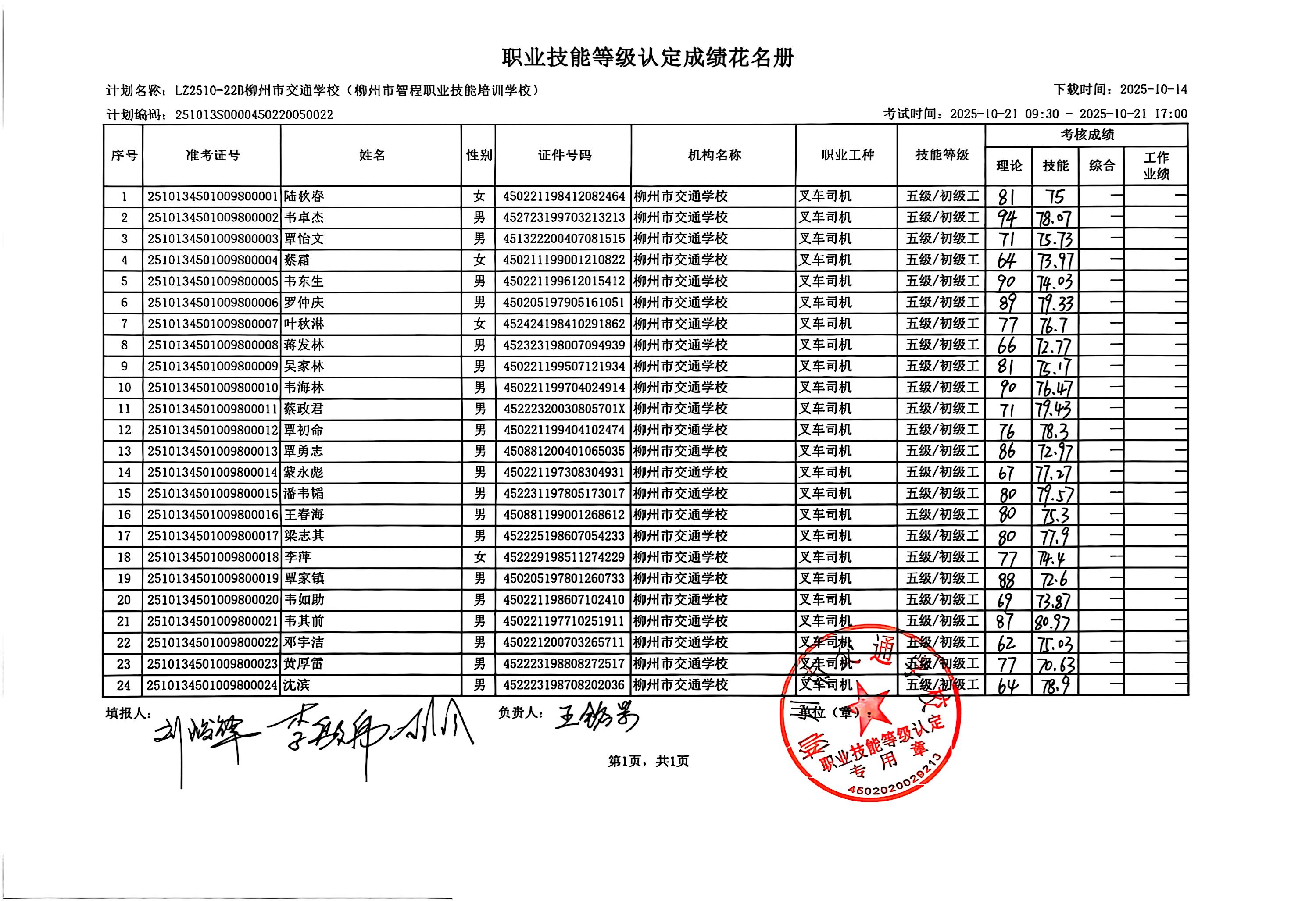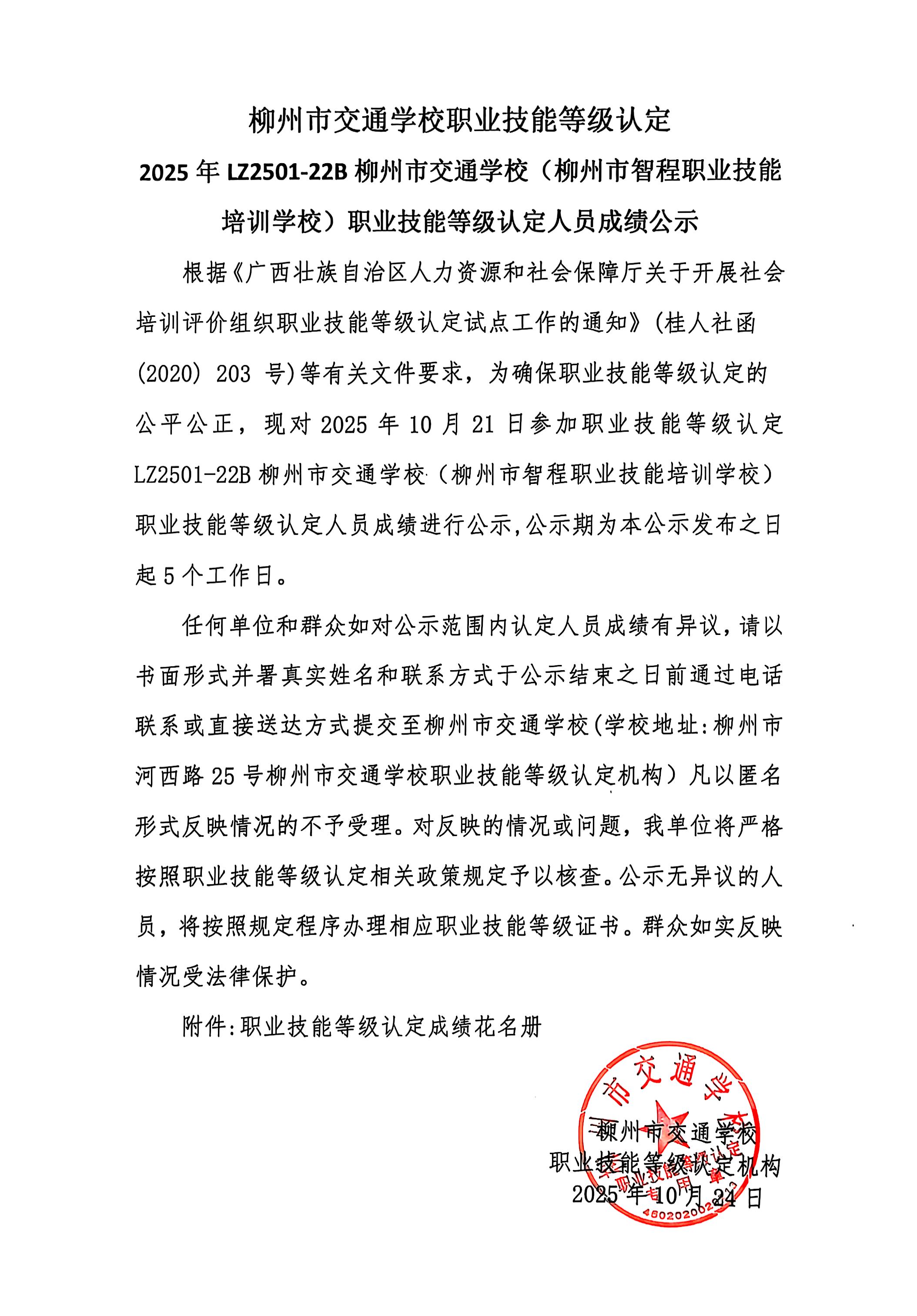 柳州市交通学校职业技能等级认定2025年LZ2501-22B柳州市交通学校(柳州市智程职业技能培训学校)职业技能等级认定人员成绩公示