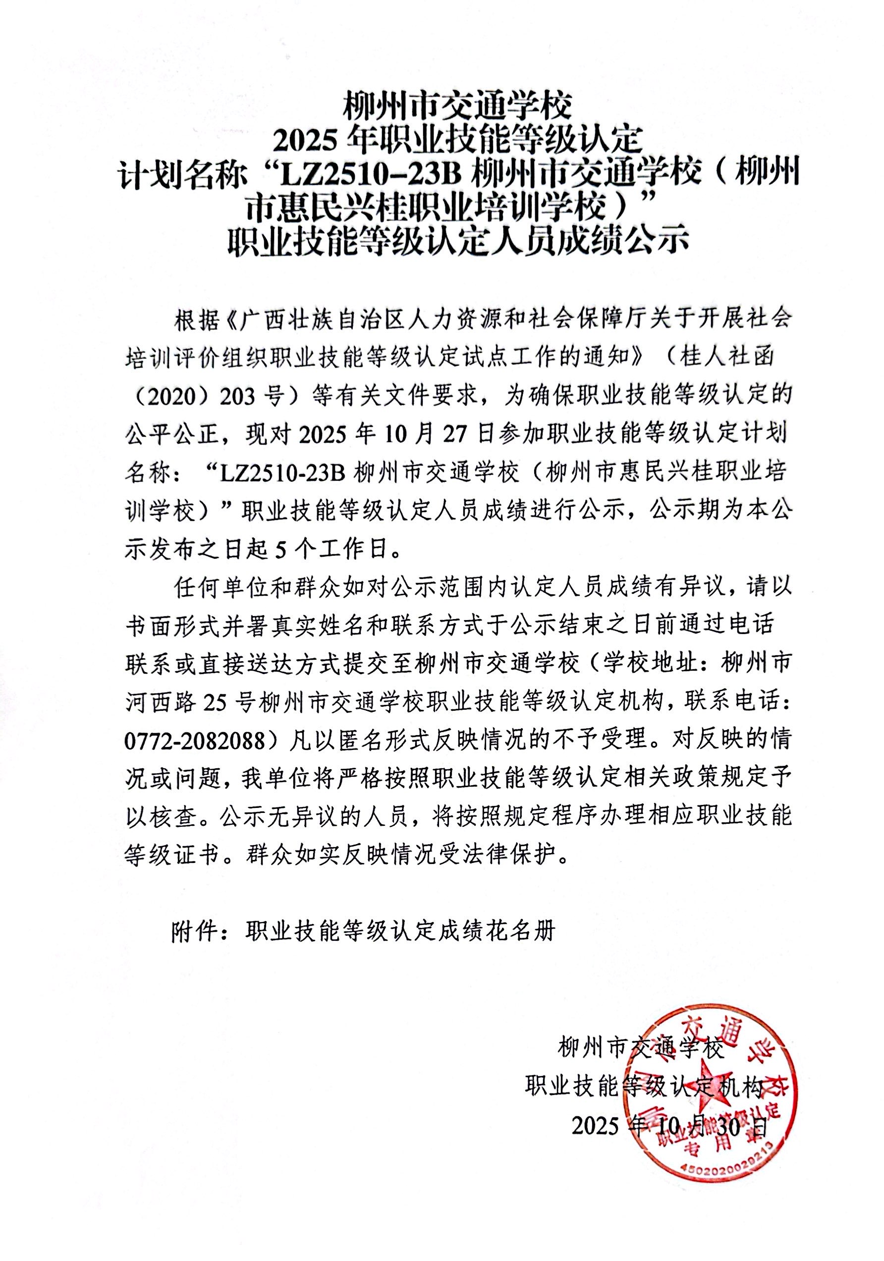 柳州市交通学校2025年职业技能等级认定计划名称“LZ2510-23B柳州市交通学校(柳州市惠民兴桂职业培训学校)”职业技能等级认定人员成绩公示