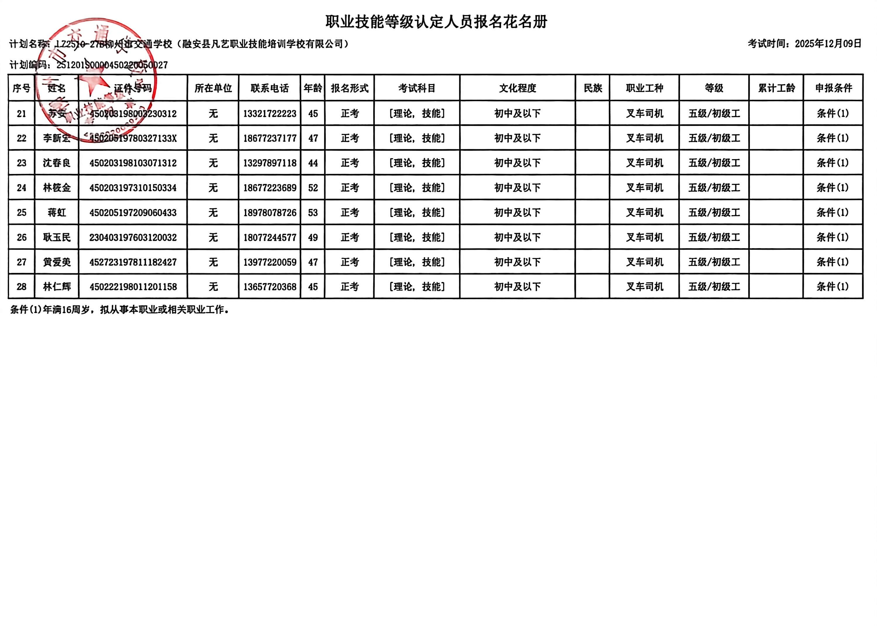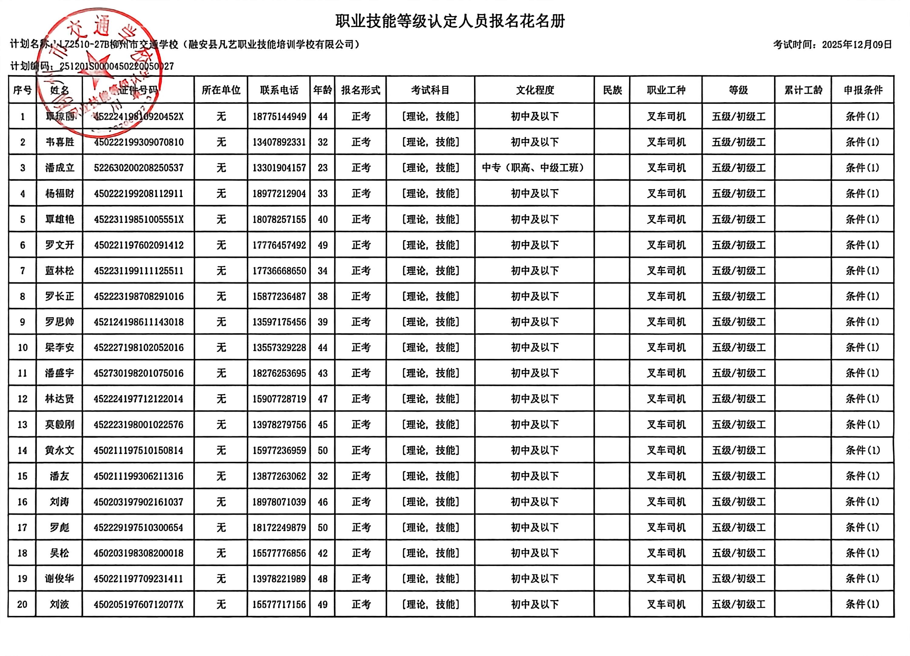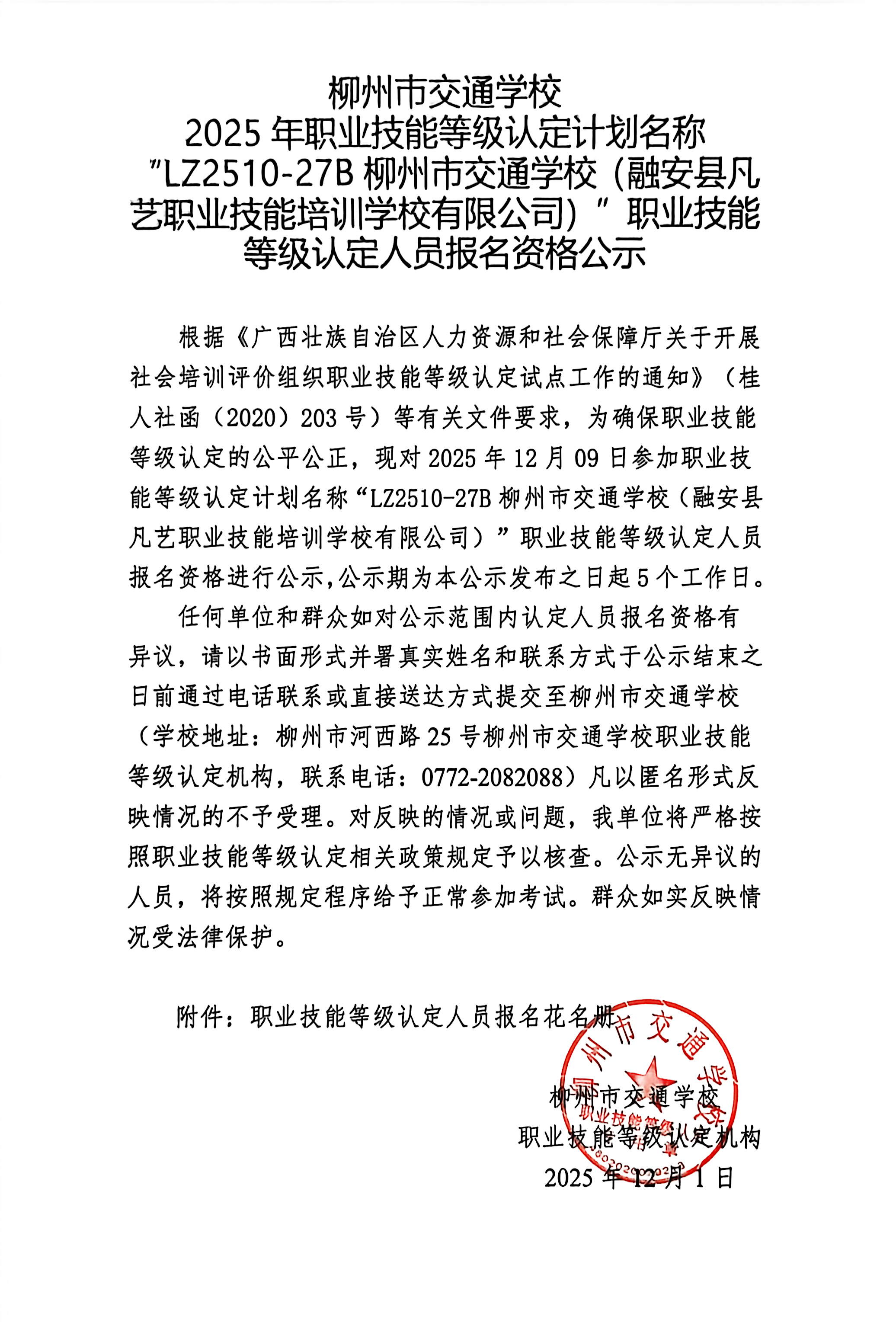 柳州巿交通学校2025年职业技能等级认定计划名称“LZ2510-27B柳州市交通学校(融安县凡艺职业技能培训学校有限公司)”职业技能等级认定人员报名资格公示