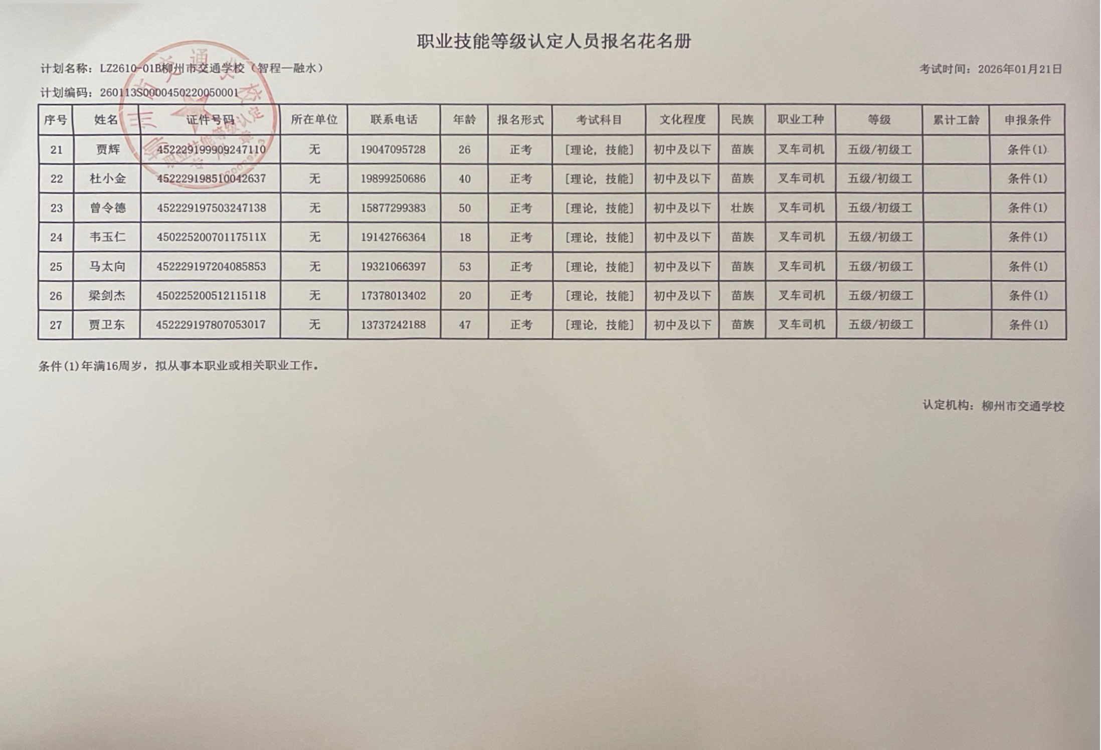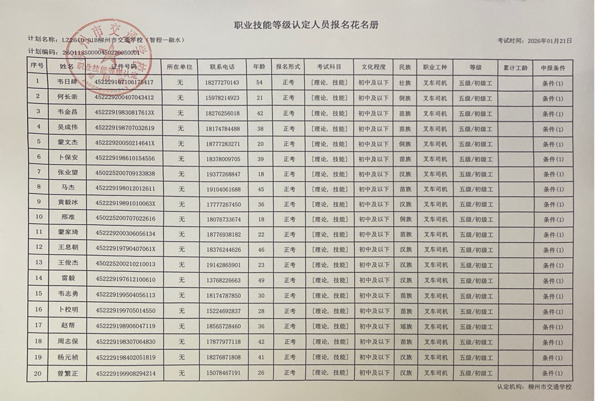 柳州巿交通学校2026年职业技能等级认定计划名称“LZ2610-01B柳州市交通学校(柳州市智程职业技能培训学校)”职业技能等级认定人员报名资格公示