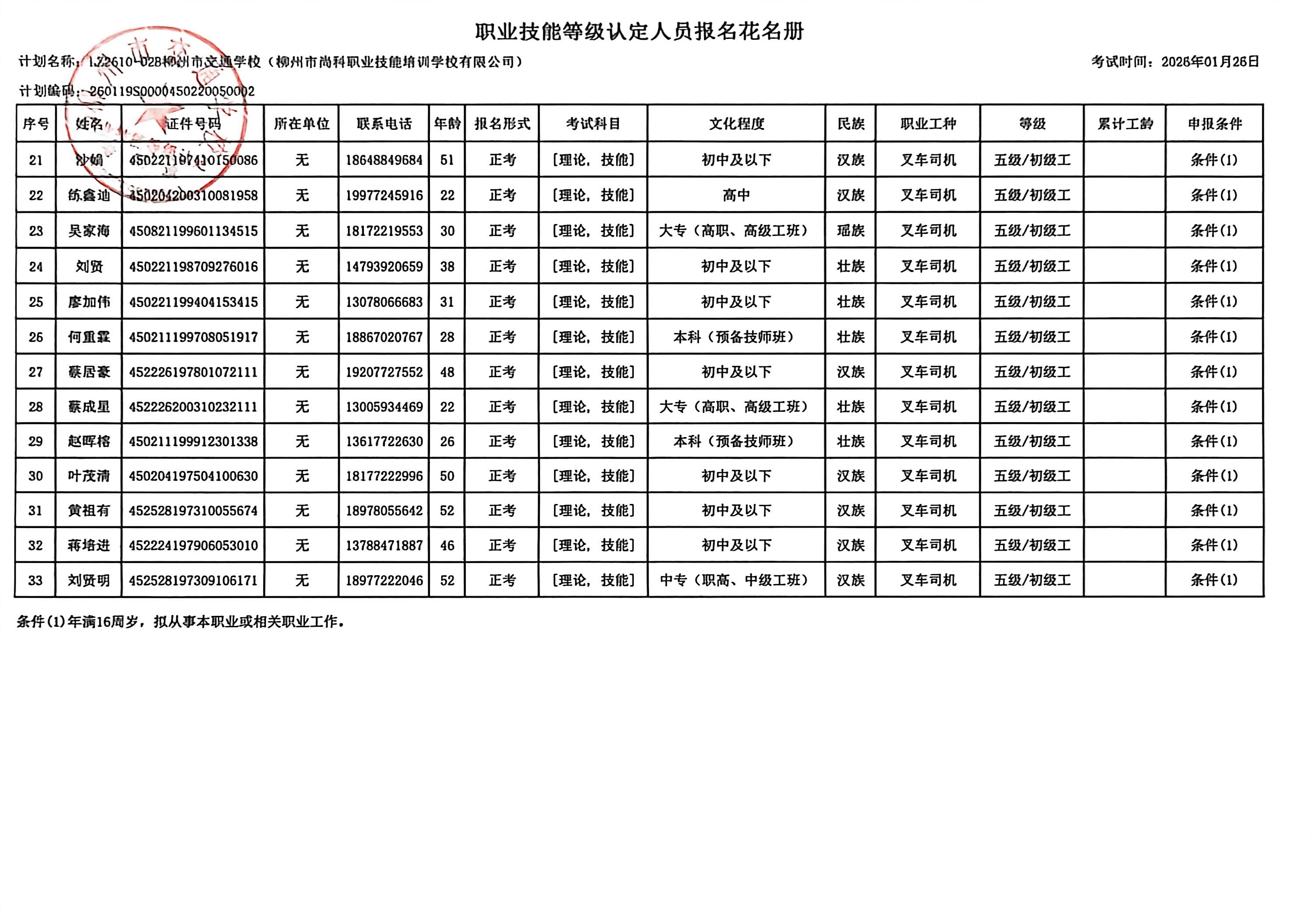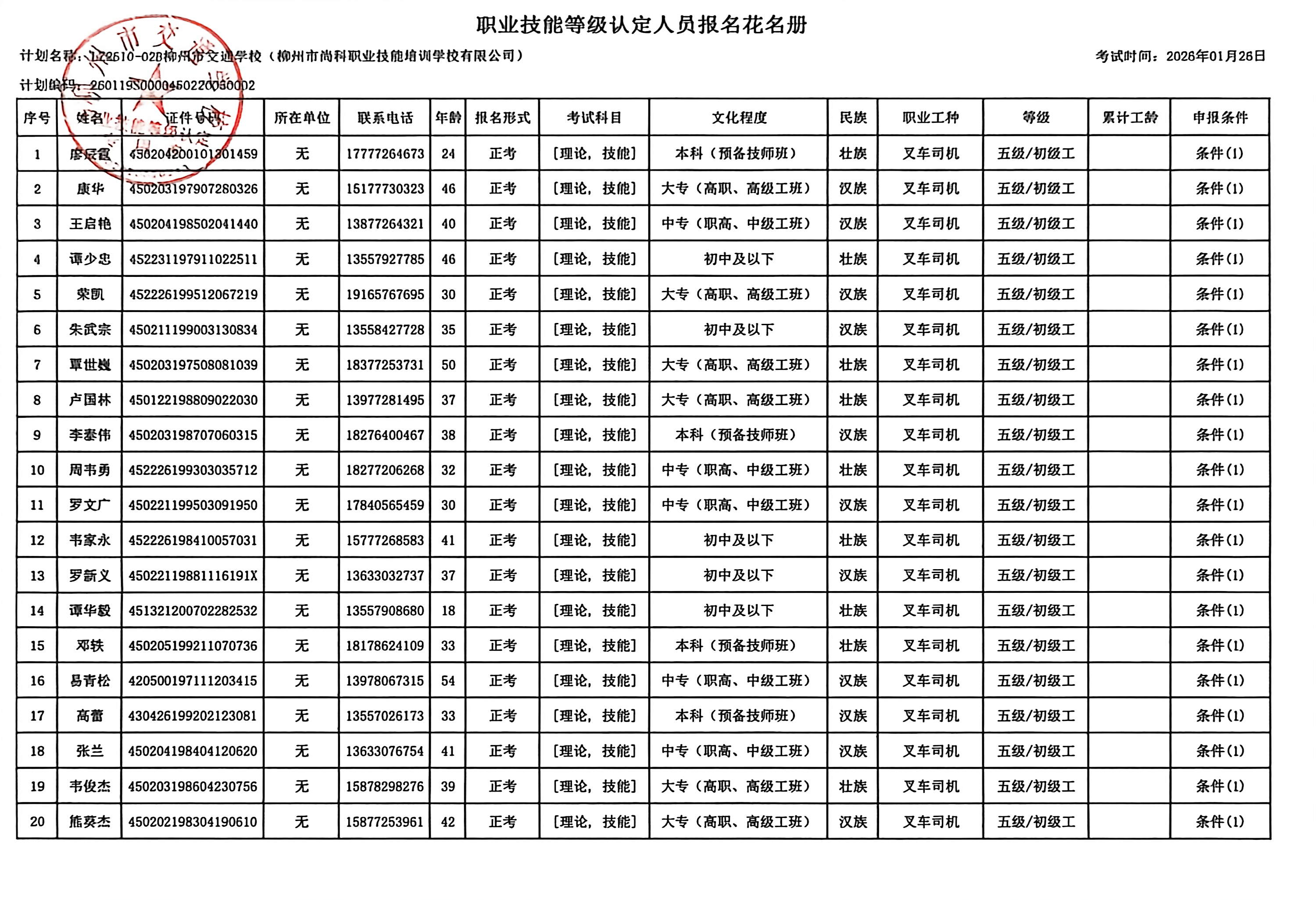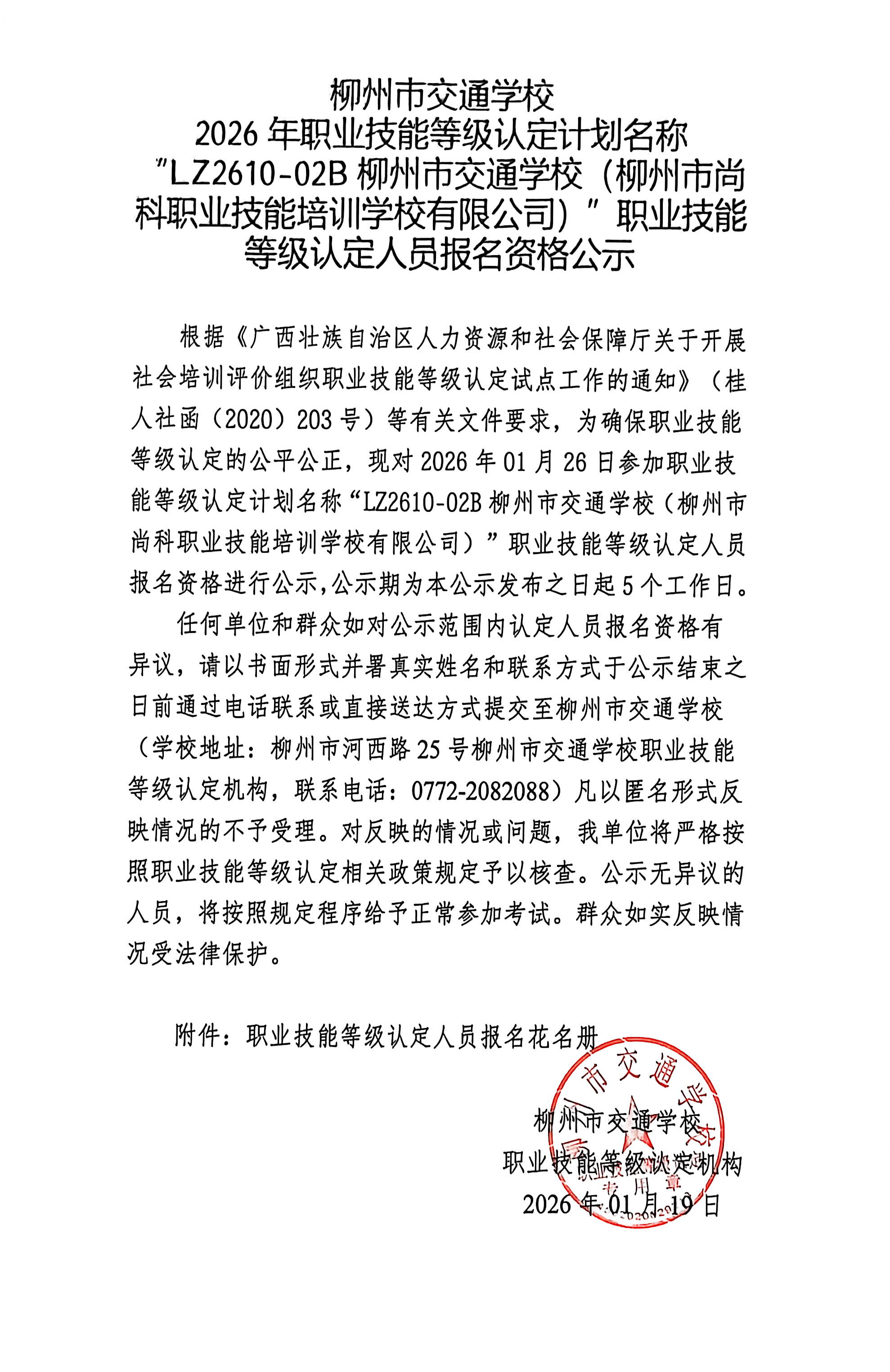 柳州巿交通学校2026年职业技能等级认定计划名称“LZ2610-02B柳州市交通学校(柳州市尚科职业技能培训学校有限公司)”职业技能等级认定人员报名资格公示