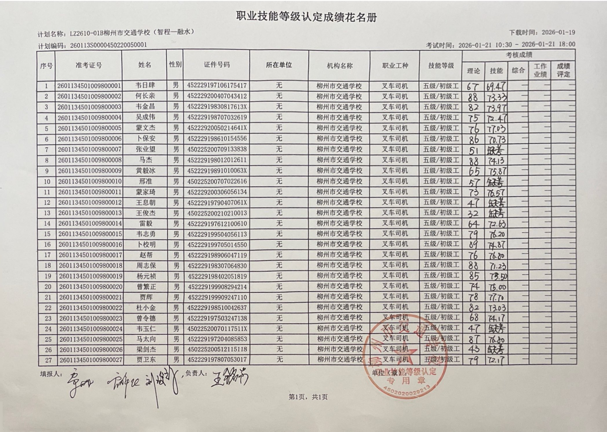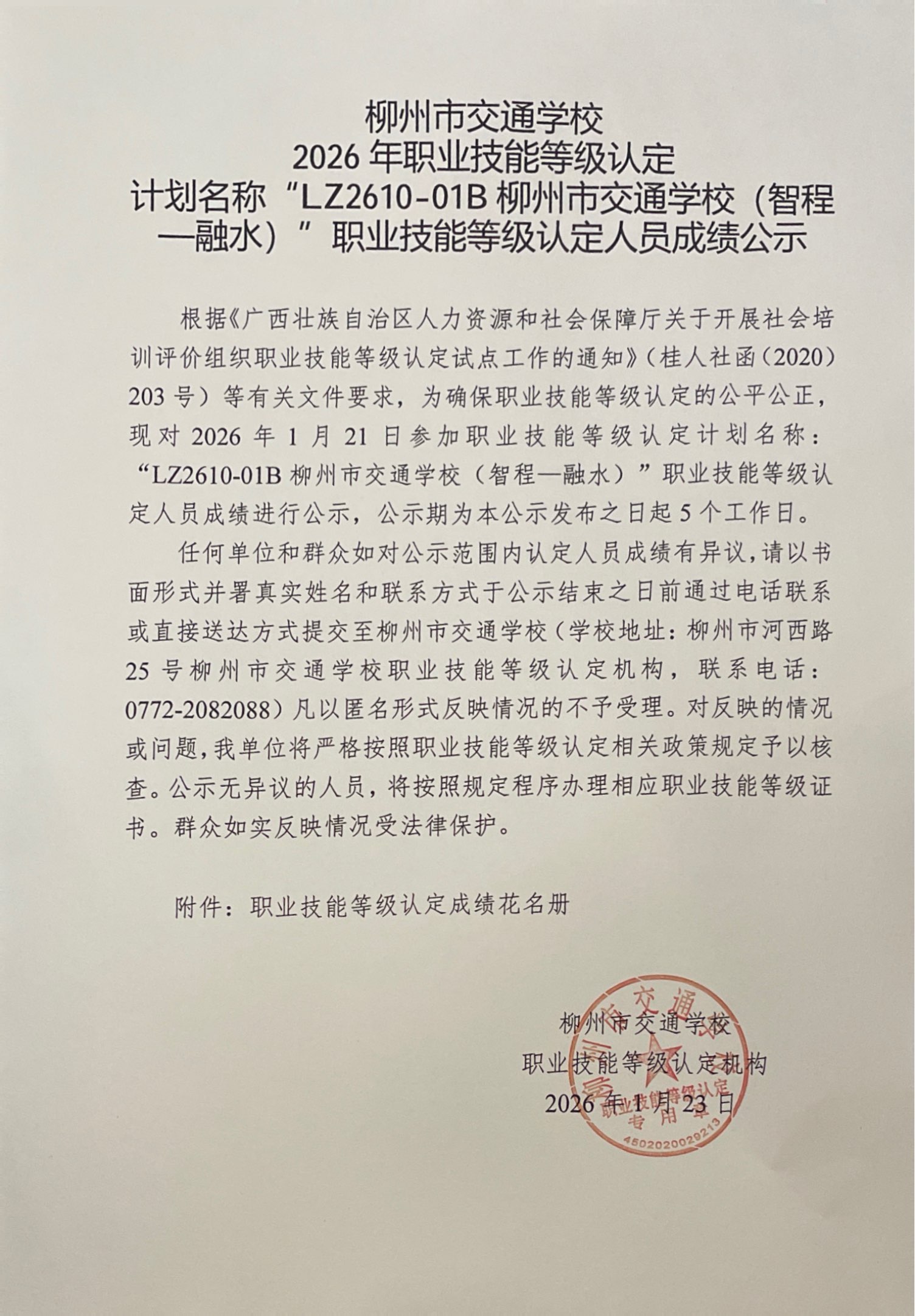 柳州市交通学校2026年职业技能等级认定计划名称“LZ2610-01B柳州市交通学校(智程—融水)”职业技能等级认定人员成绩公示