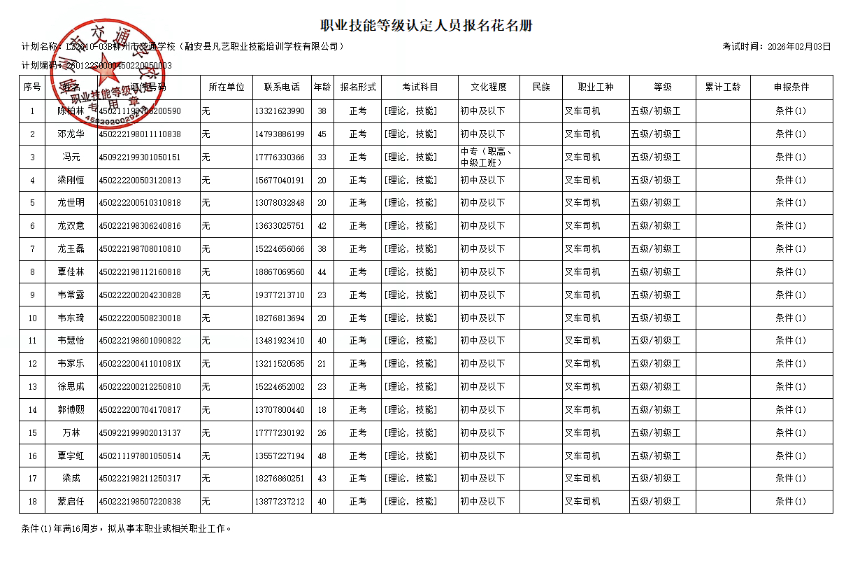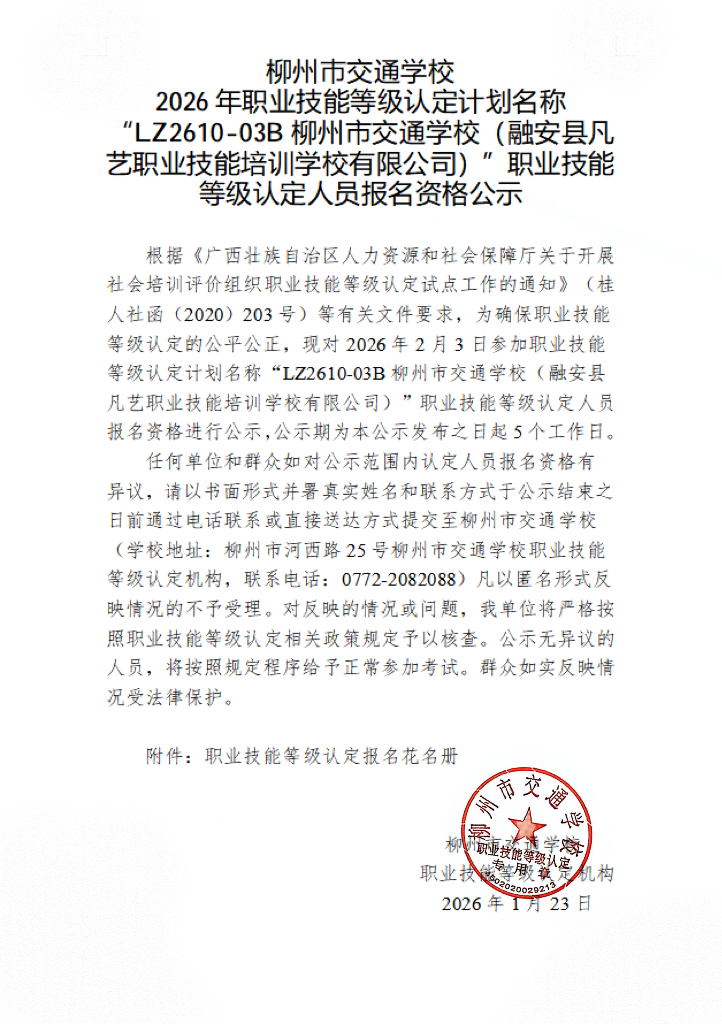 柳州巿交通学校2026年职业技能等级认定计划名称“LZ2610-03B柳州市交通学校(融安县凡艺职业技能培训学校有限公司)”职业技能等级认定人员报名资格公示