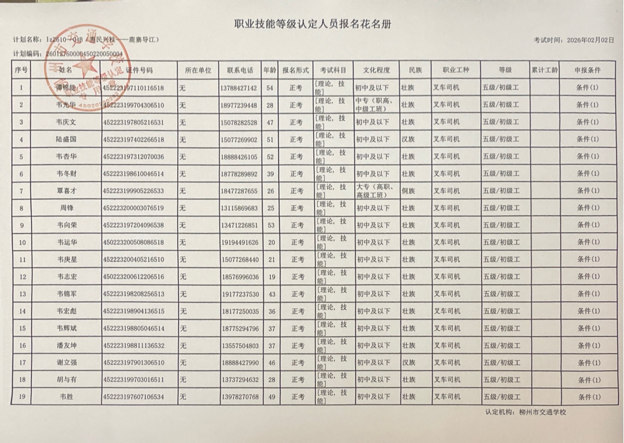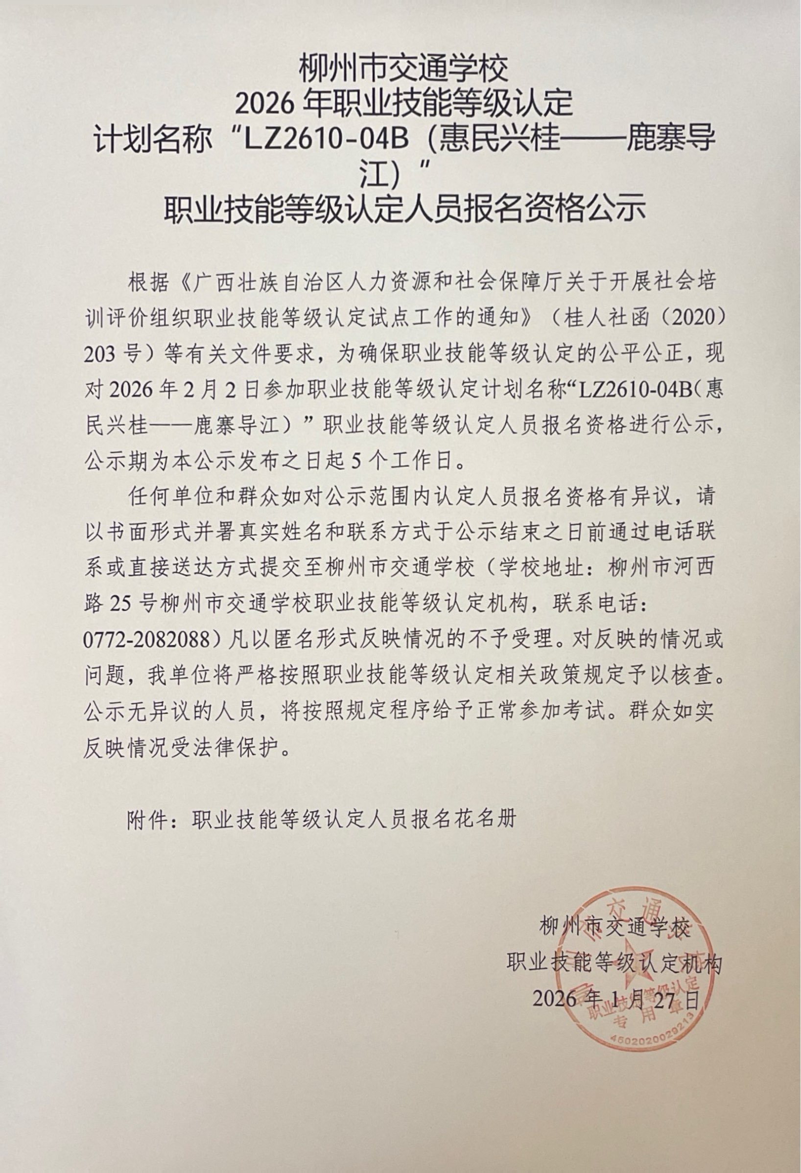 柳州巿交通学校2026年职业技能等级认定计划名称“LZ2610-04B(惠民兴桂——鹿寨导江)”职业技能等级认定人员报名资格公示