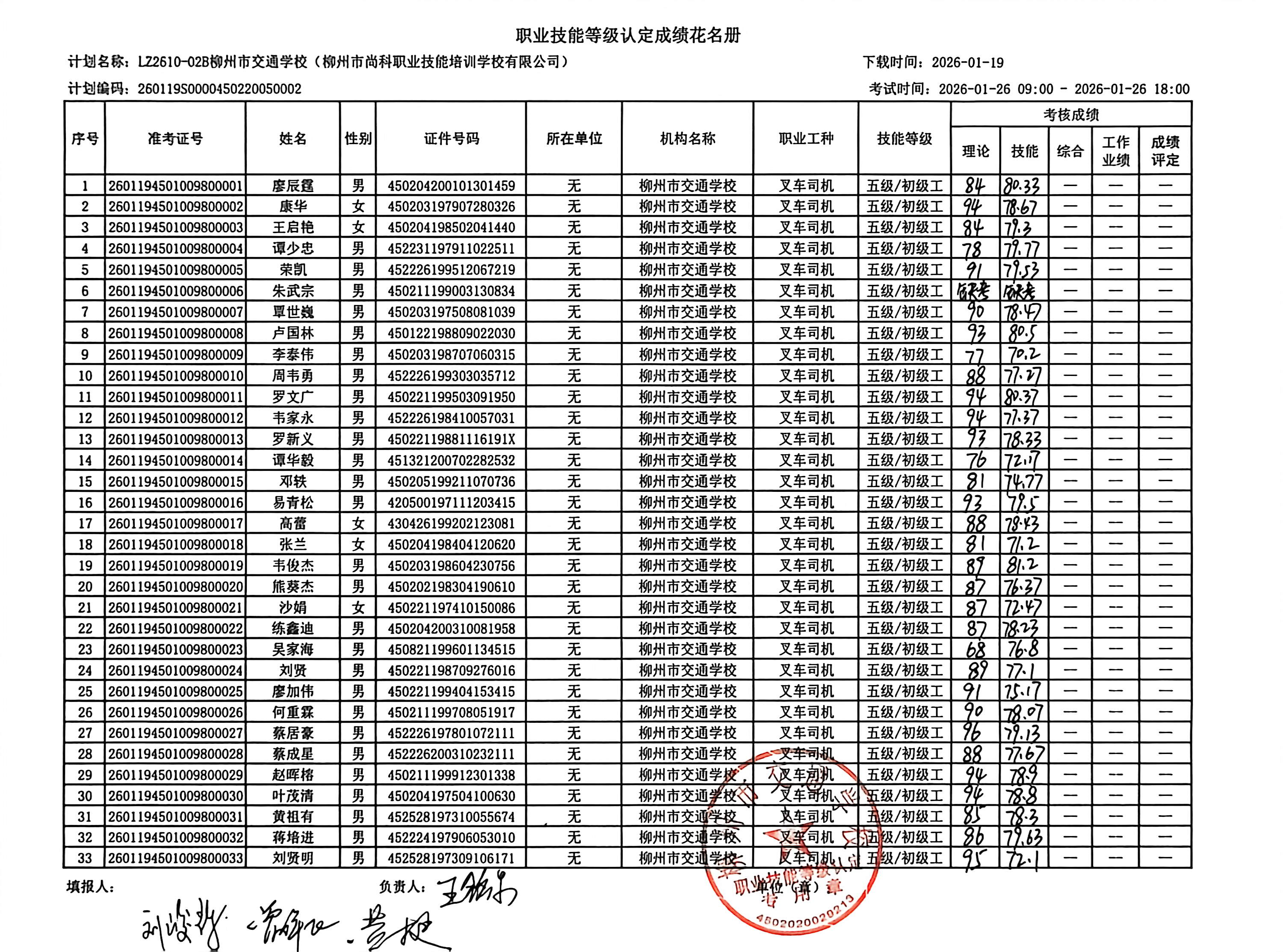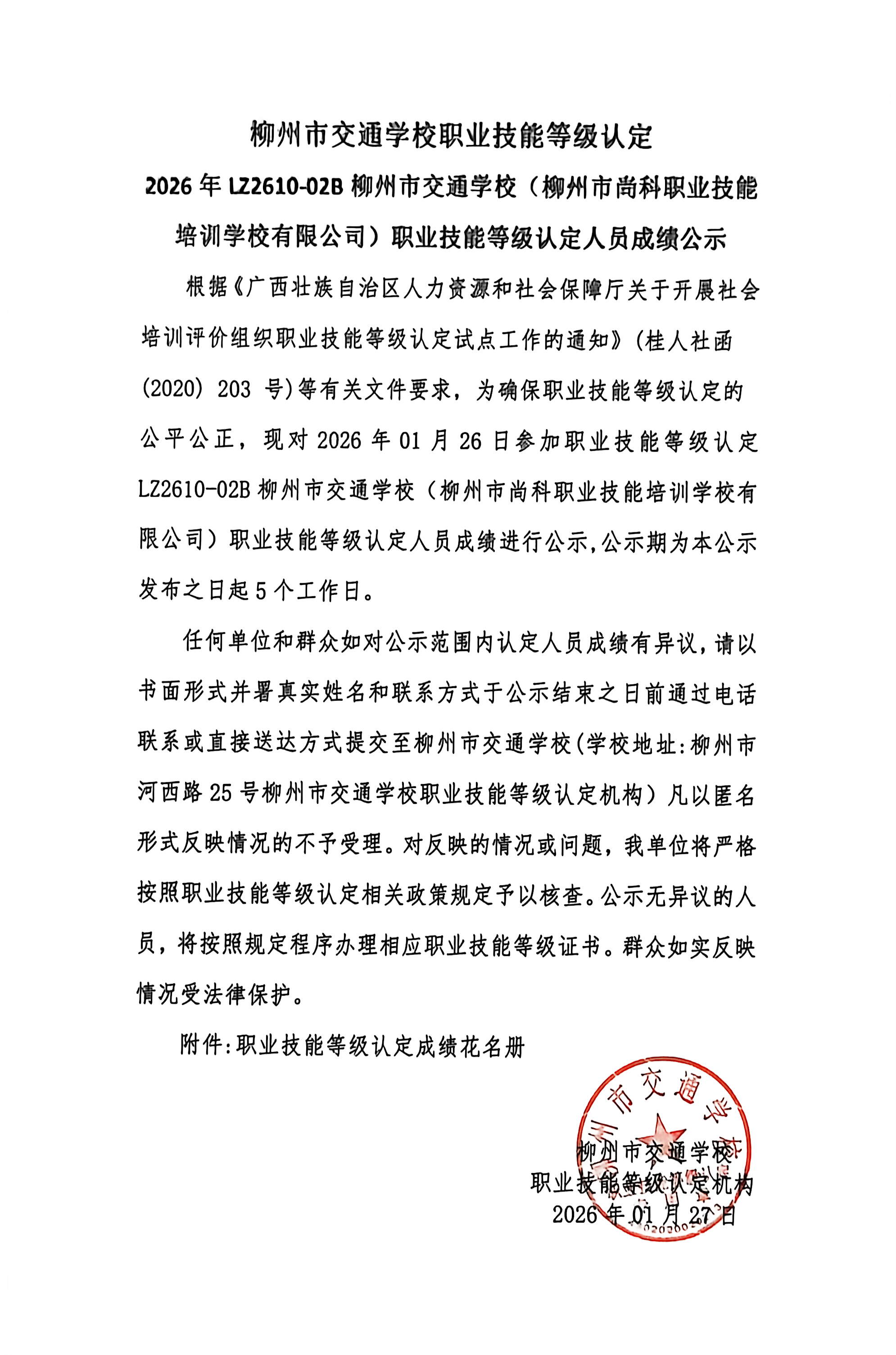 柳州市交通学校职业技能等级认定2026年LZ2610-02B柳州市交通学校(柳州市尚科职业技能培训学校有限公司)职业技能等级认定人员成绩公示