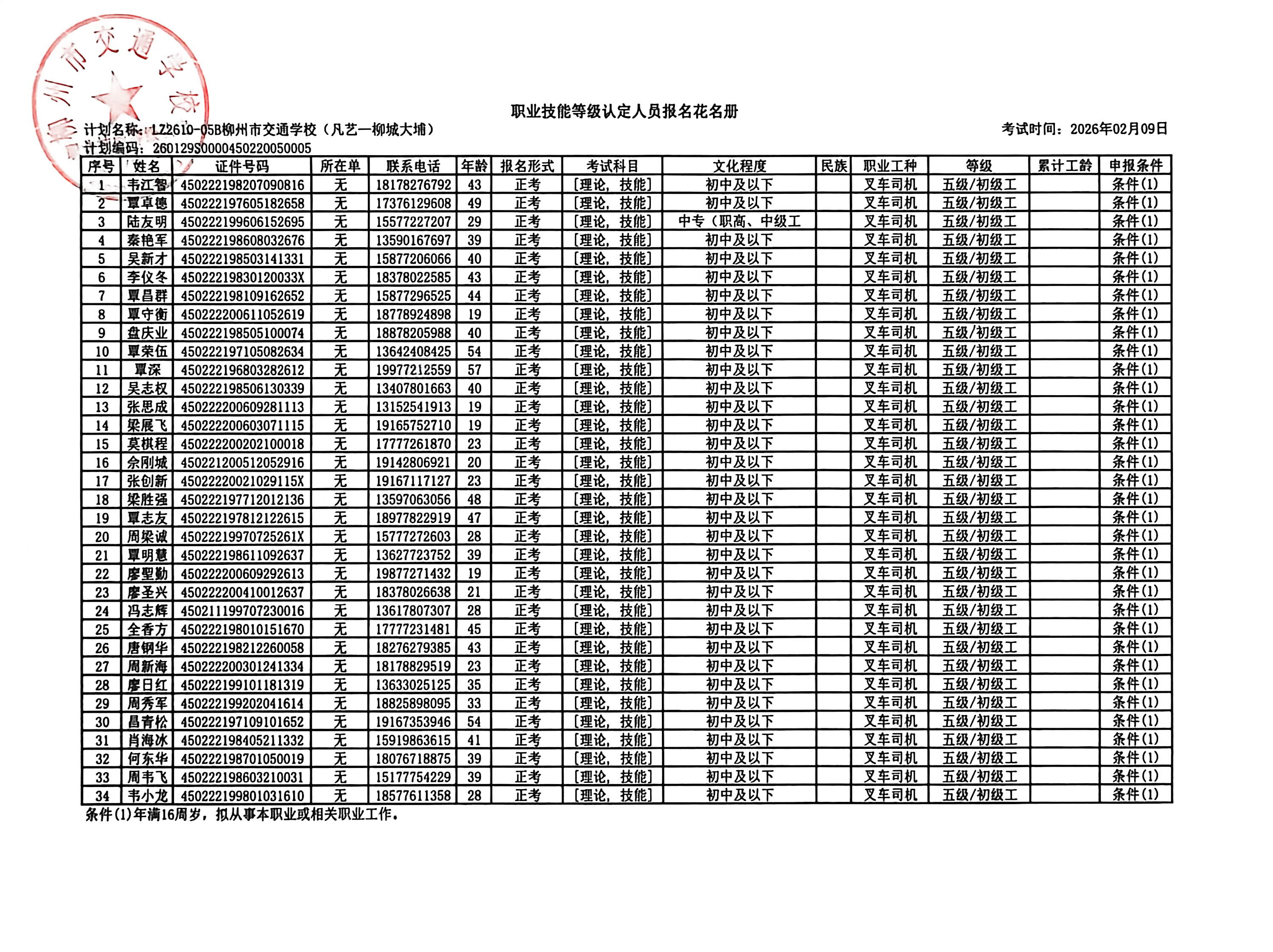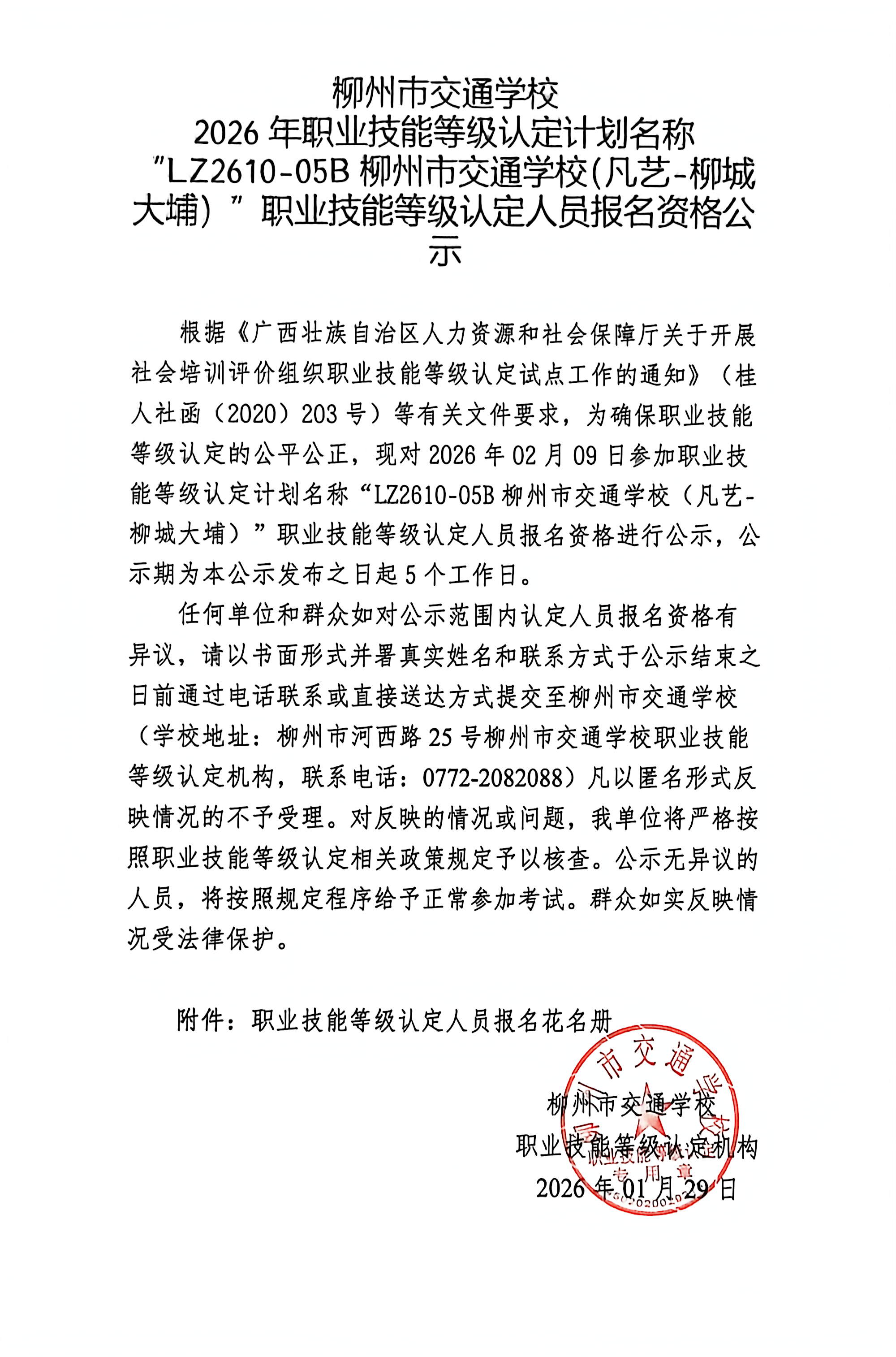 柳州巿交通学校2026年职业技能等级认定计划名称“LZ2610-05B柳州市交通学校(凡艺-柳城大埔)”职业技能等级认定人员报名资格公示