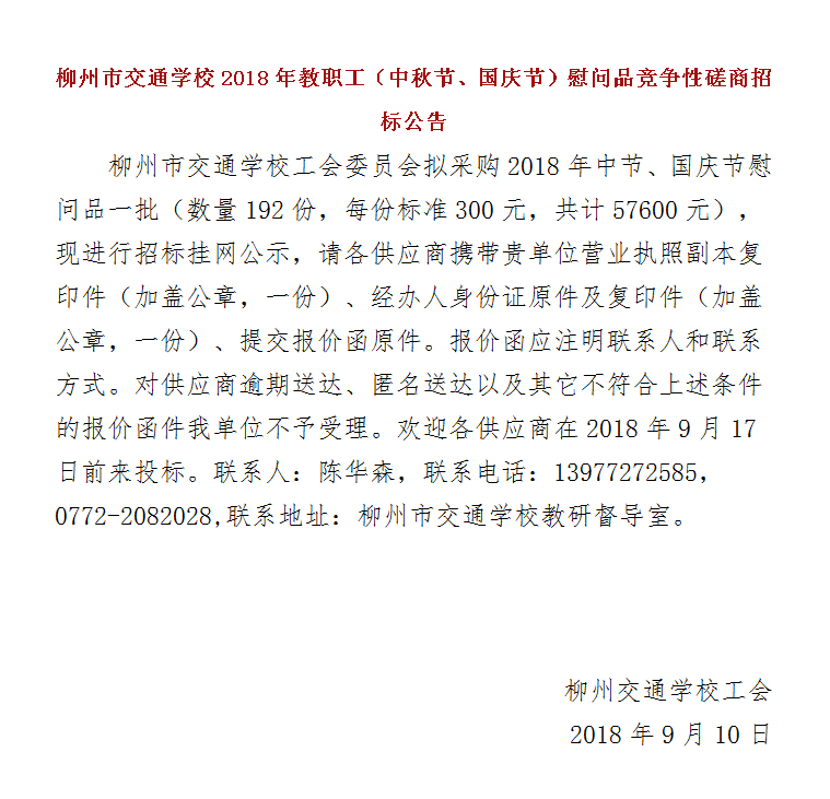 柳州市交通学校2018年教职工(中秋节、国庆节)慰问品竞争性磋商招标公告