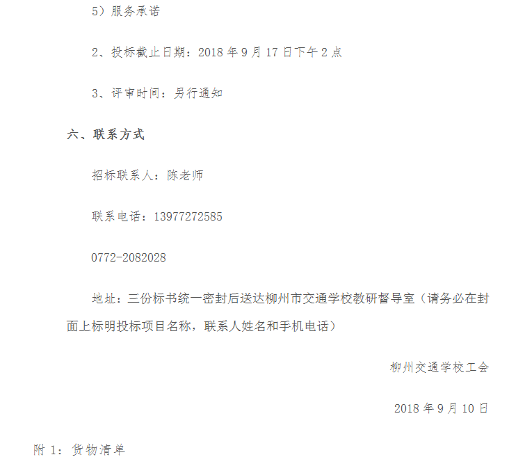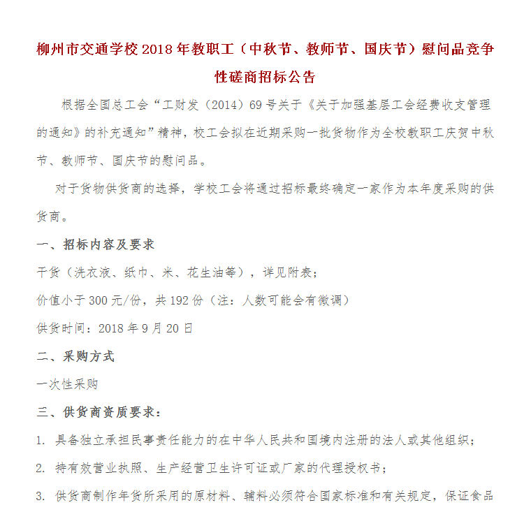 柳州市交通学校2018年教职工(中秋节、教师节、国庆节)慰问品竞争性磋商招标公告
