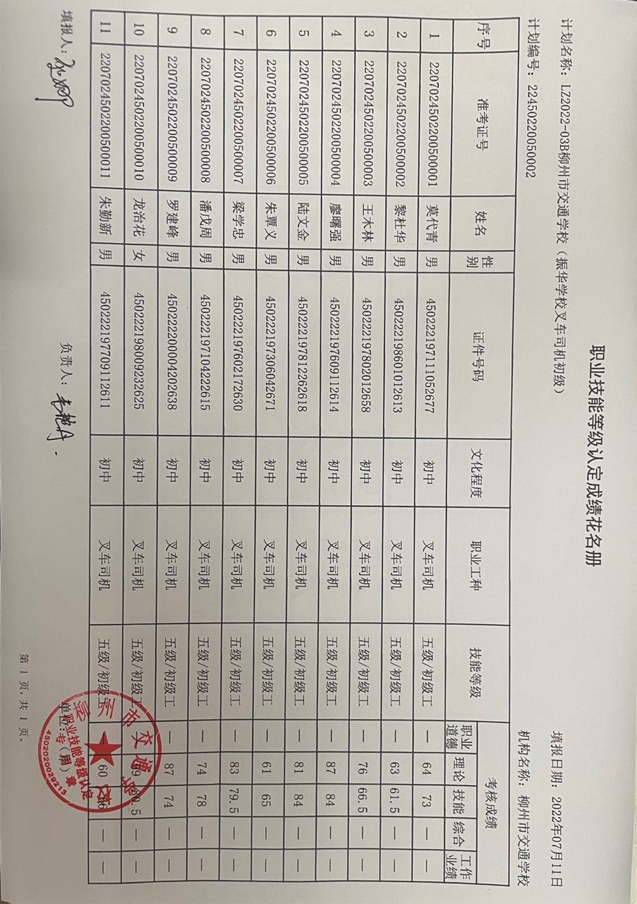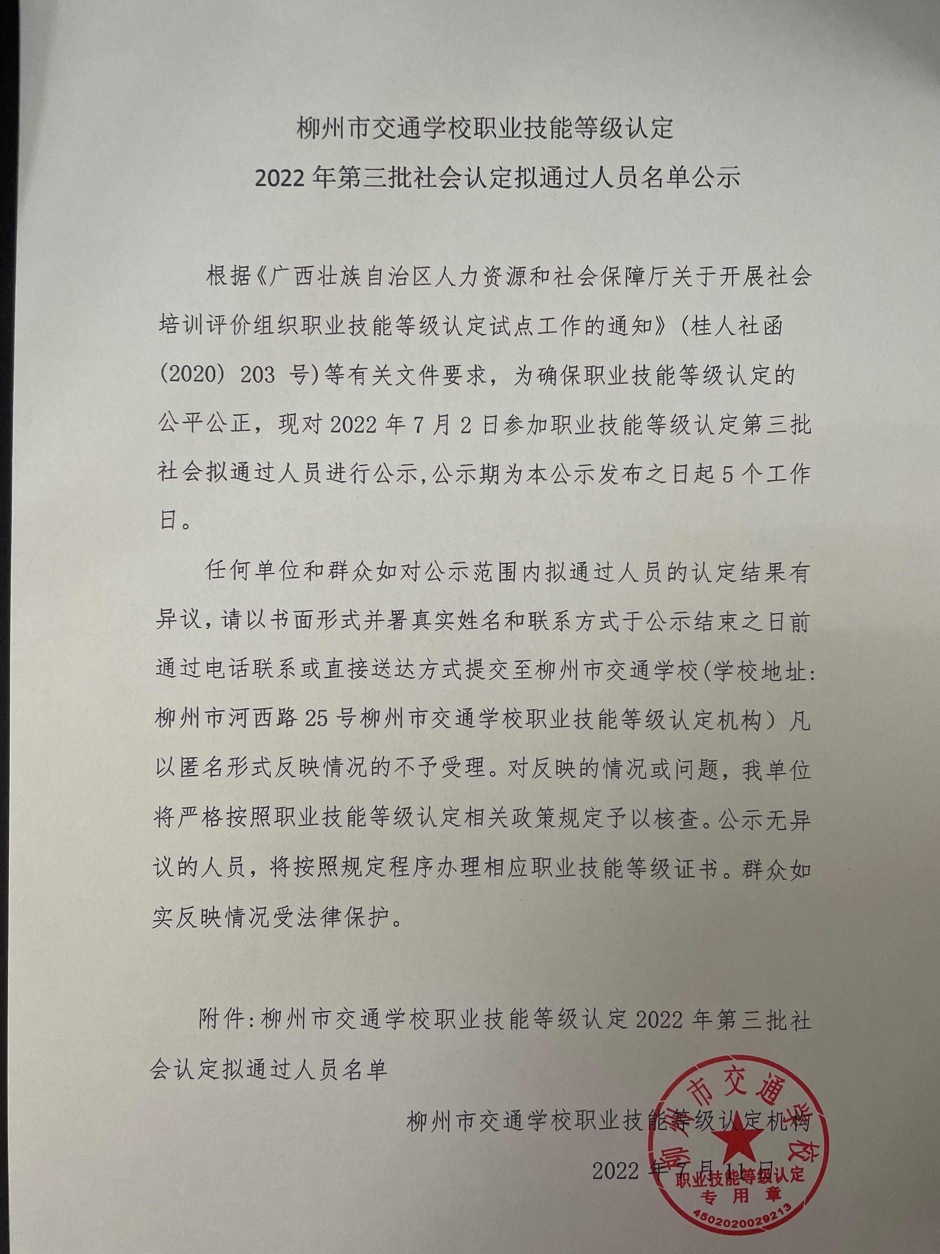 柳州市交通学校职业技能等级认定2022年三期叉车初级认定拟通过人员名单公示