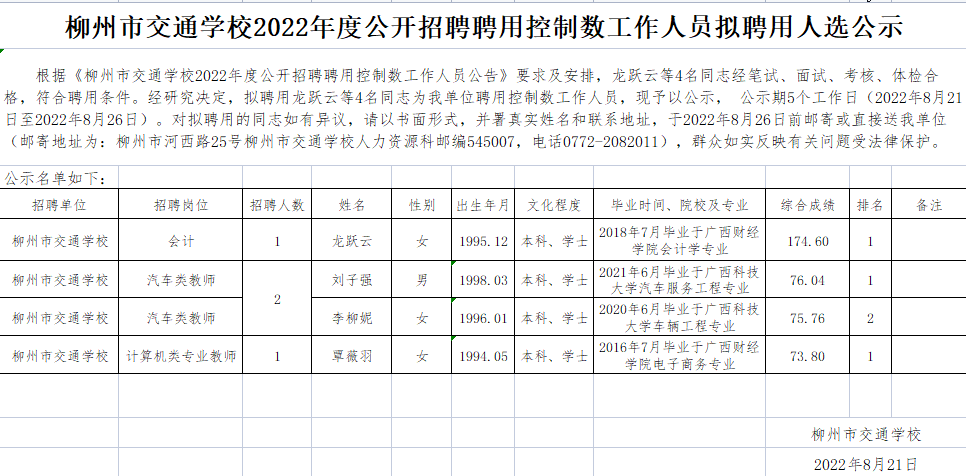 2022年柳州市交通学校公开招聘聘用控制数工作人员拟聘用人选公示