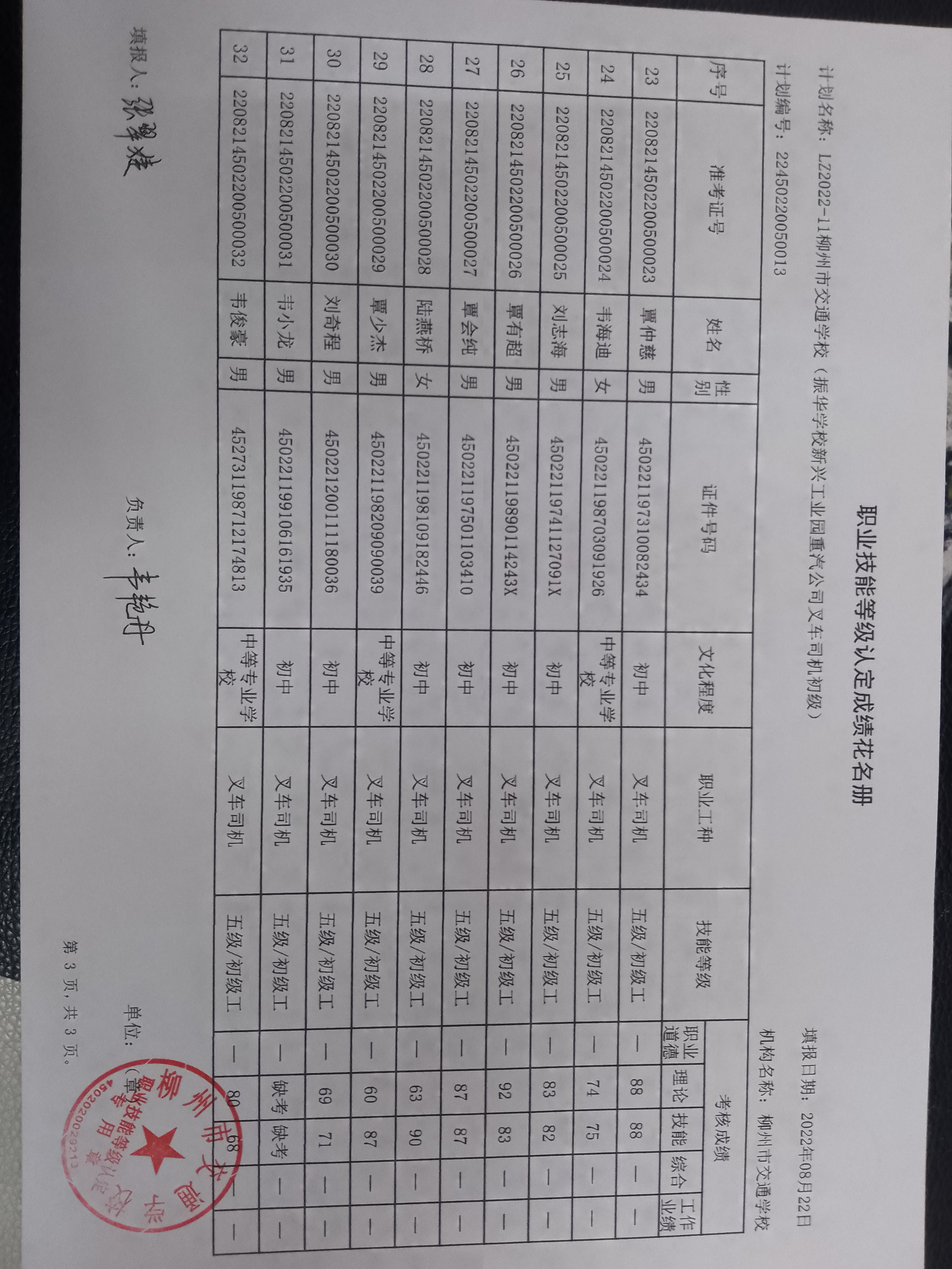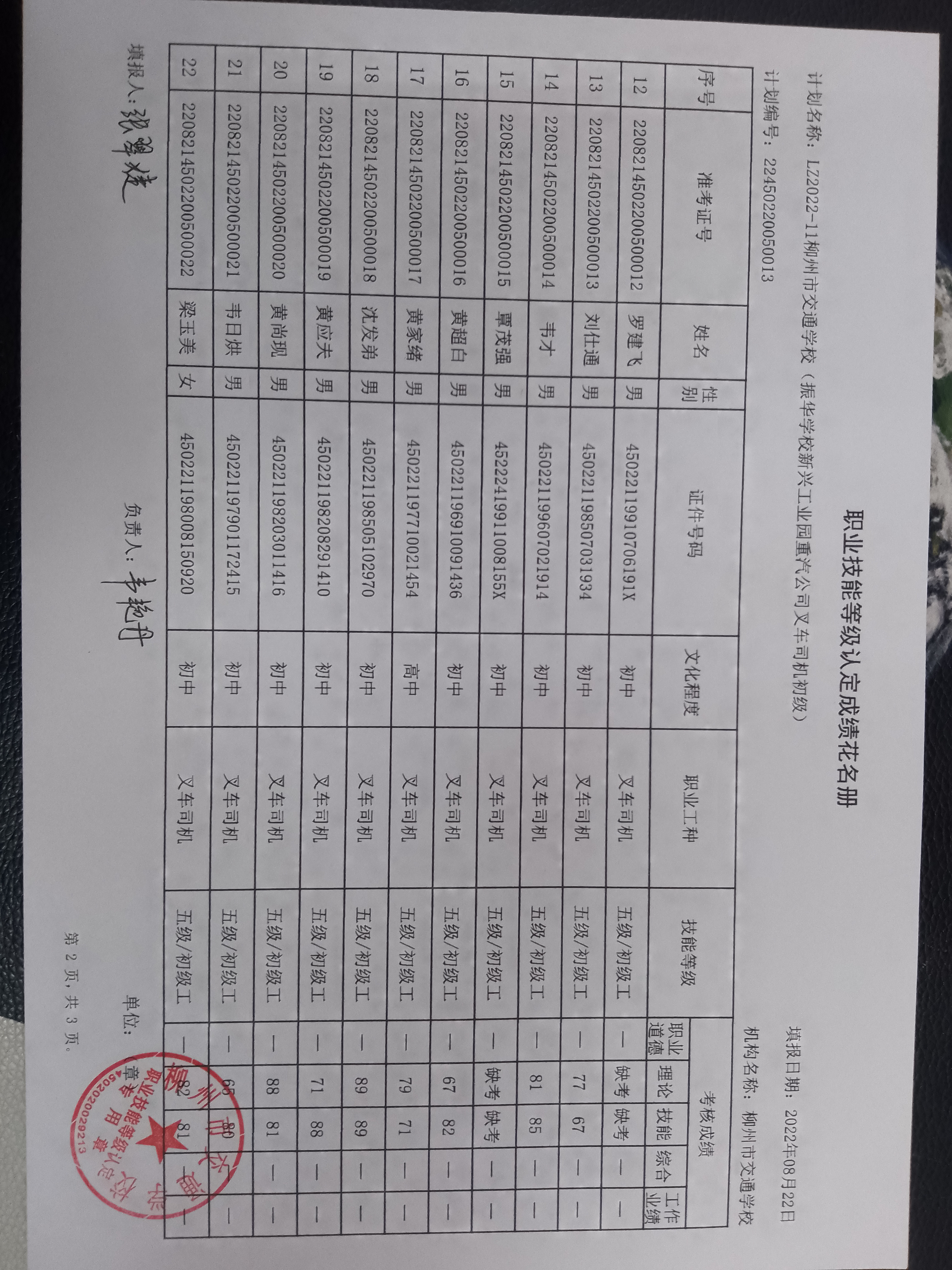 柳州市交通学校职业技能等级认定2022年十一批社会认定拟通过人员名单公示