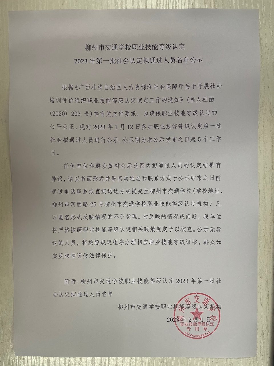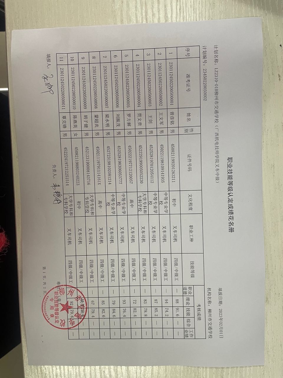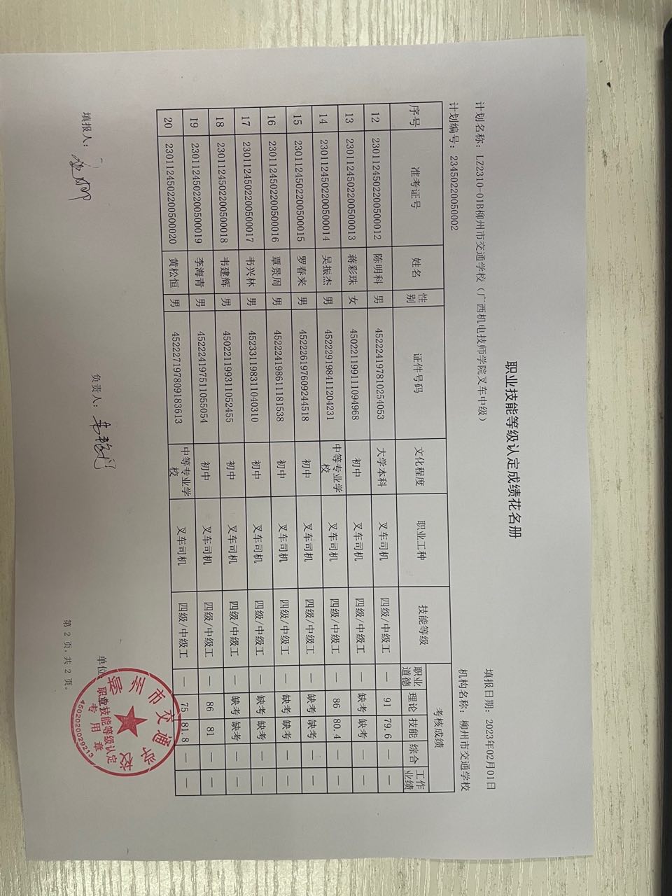 柳州市交通学校职业技能等级认定2023年第一批叉车初级认定拟通过人员名单公示