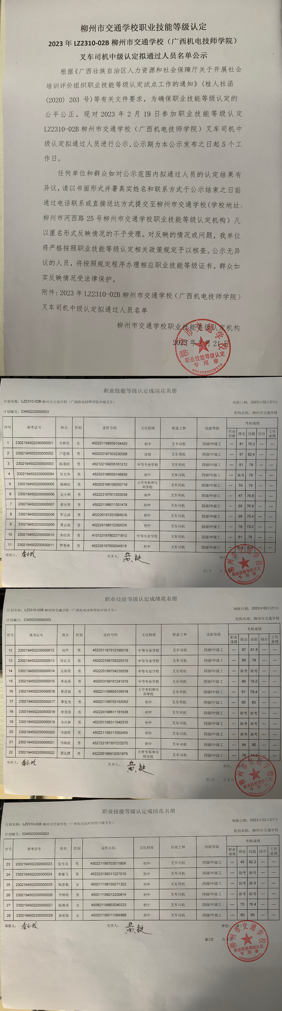 柳州市交通学校职业技能等级认定 2023年LZ2310-02B柳州市交通学校(广西机电技师学院)叉车司机中级认定拟通过人员名单公示