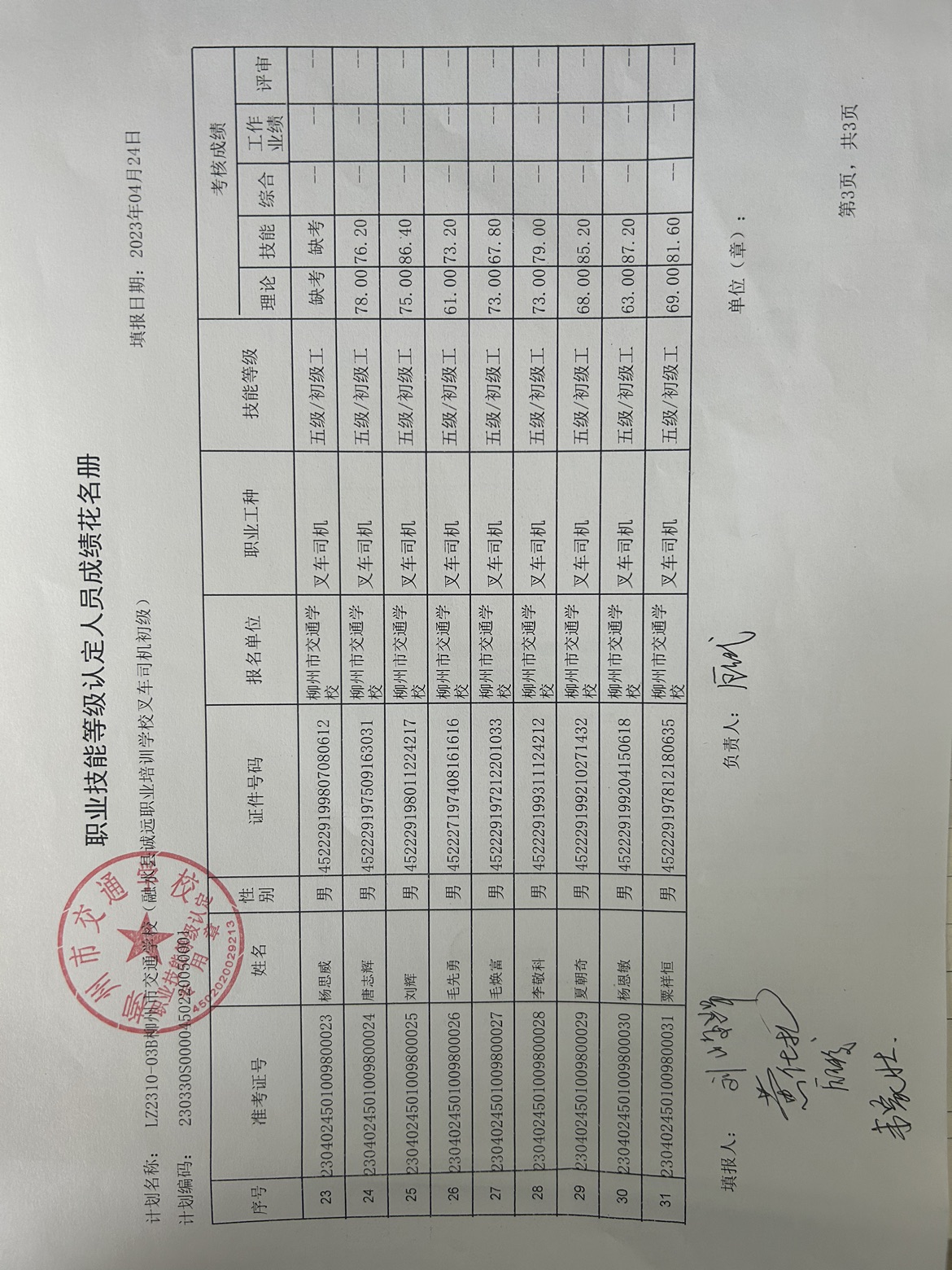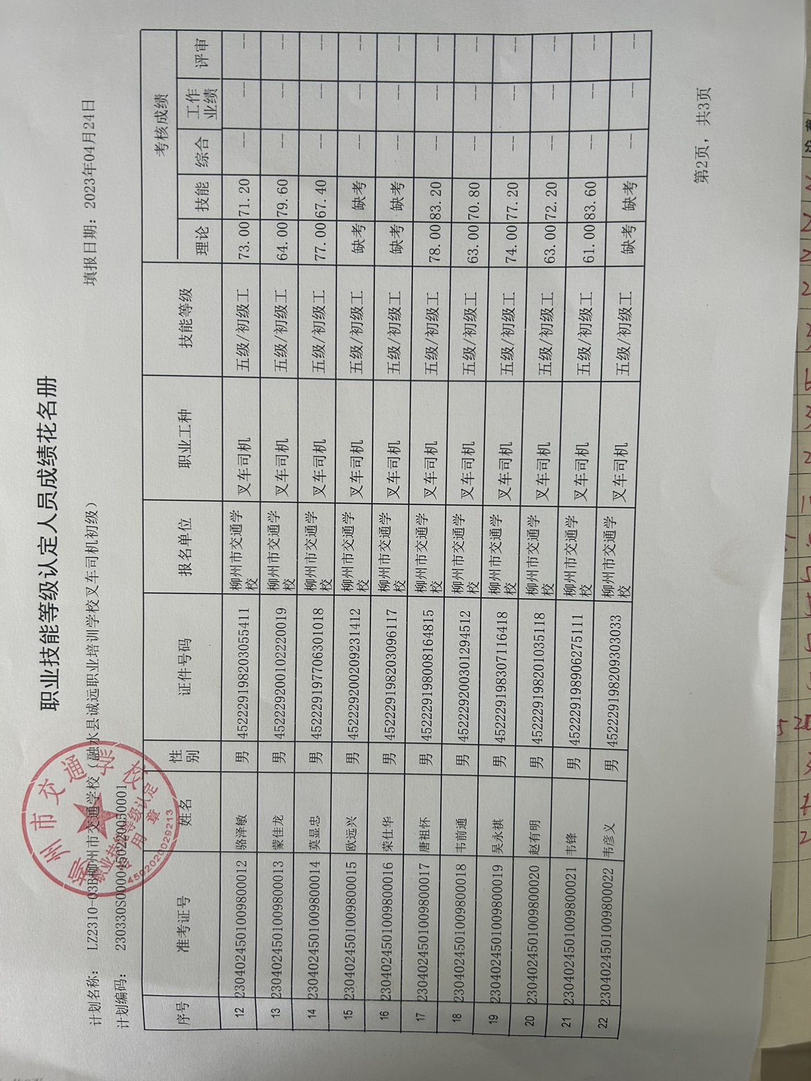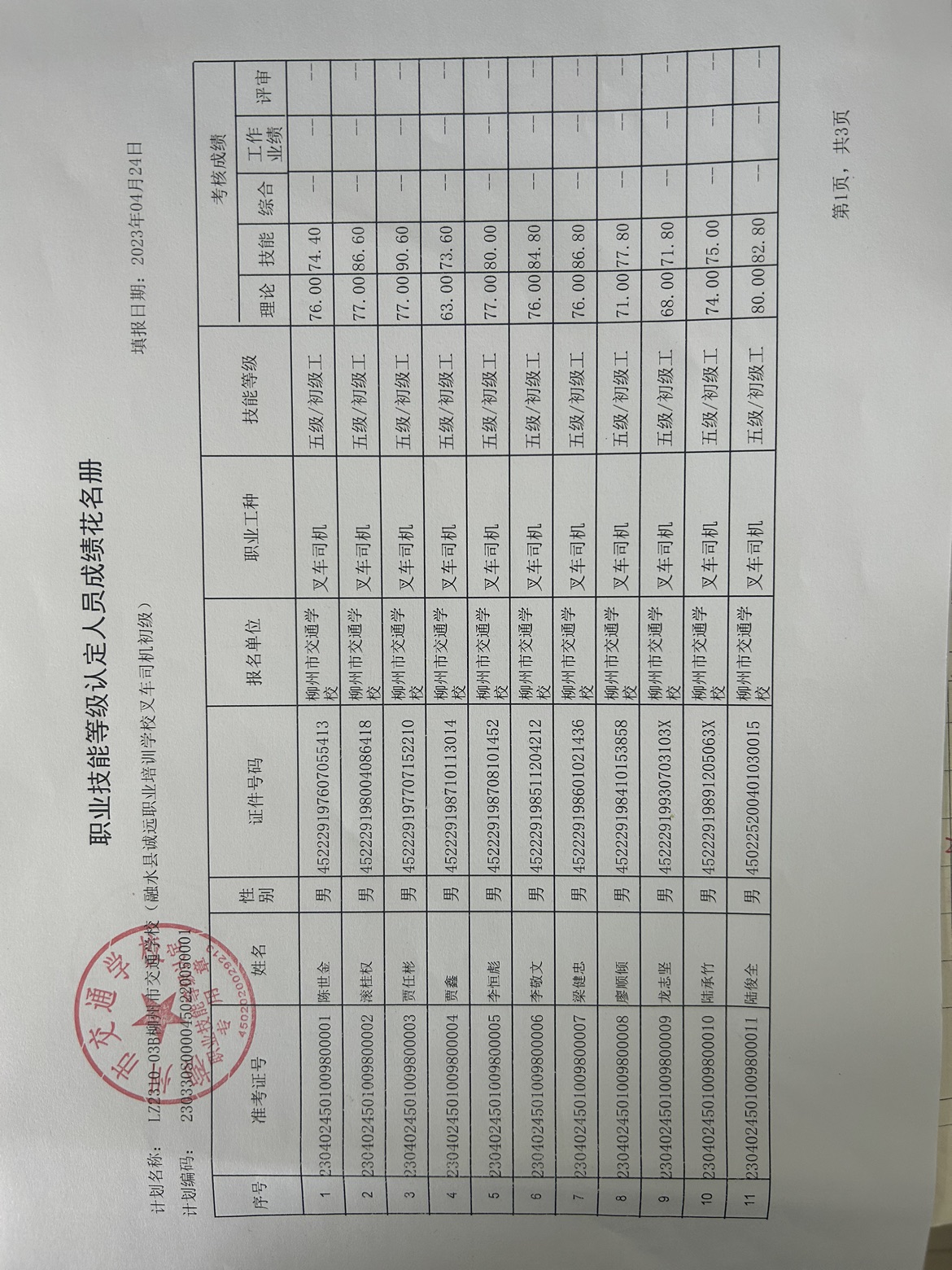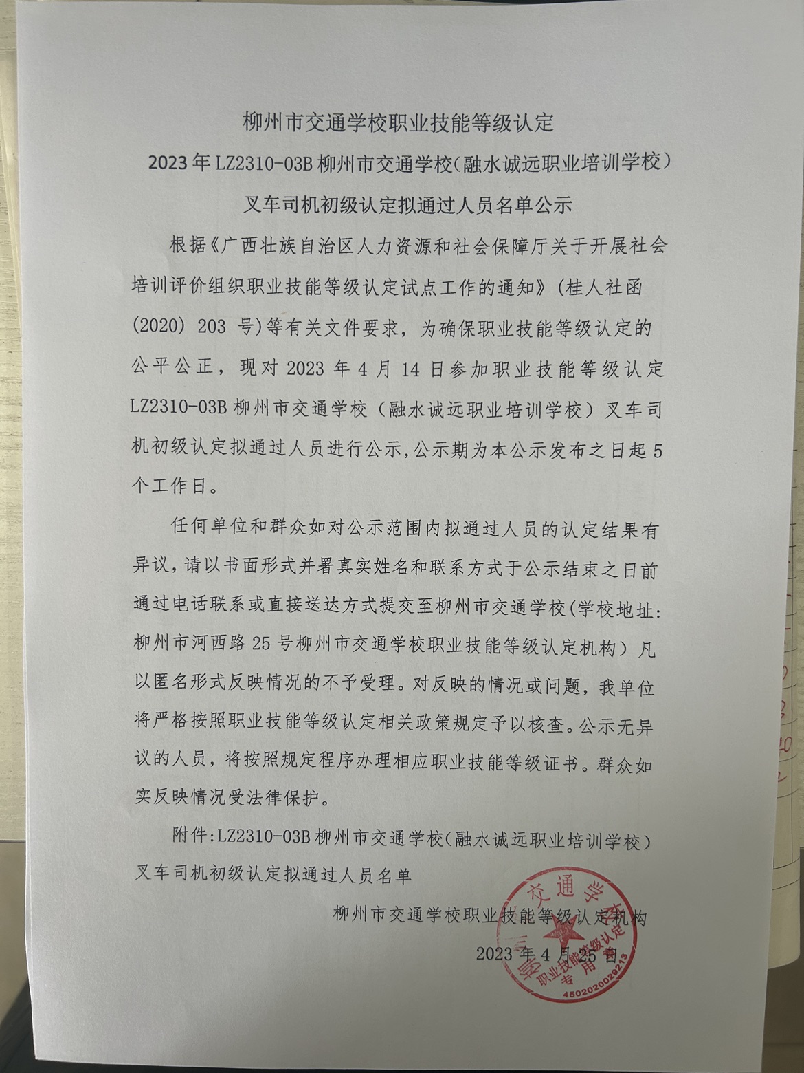 柳州市交通学校职业技能等级认定2023年Lz2023-03B柳州市交通学校(融水诚远职业培训学校)叉车初级认定拟通过人员名单公示