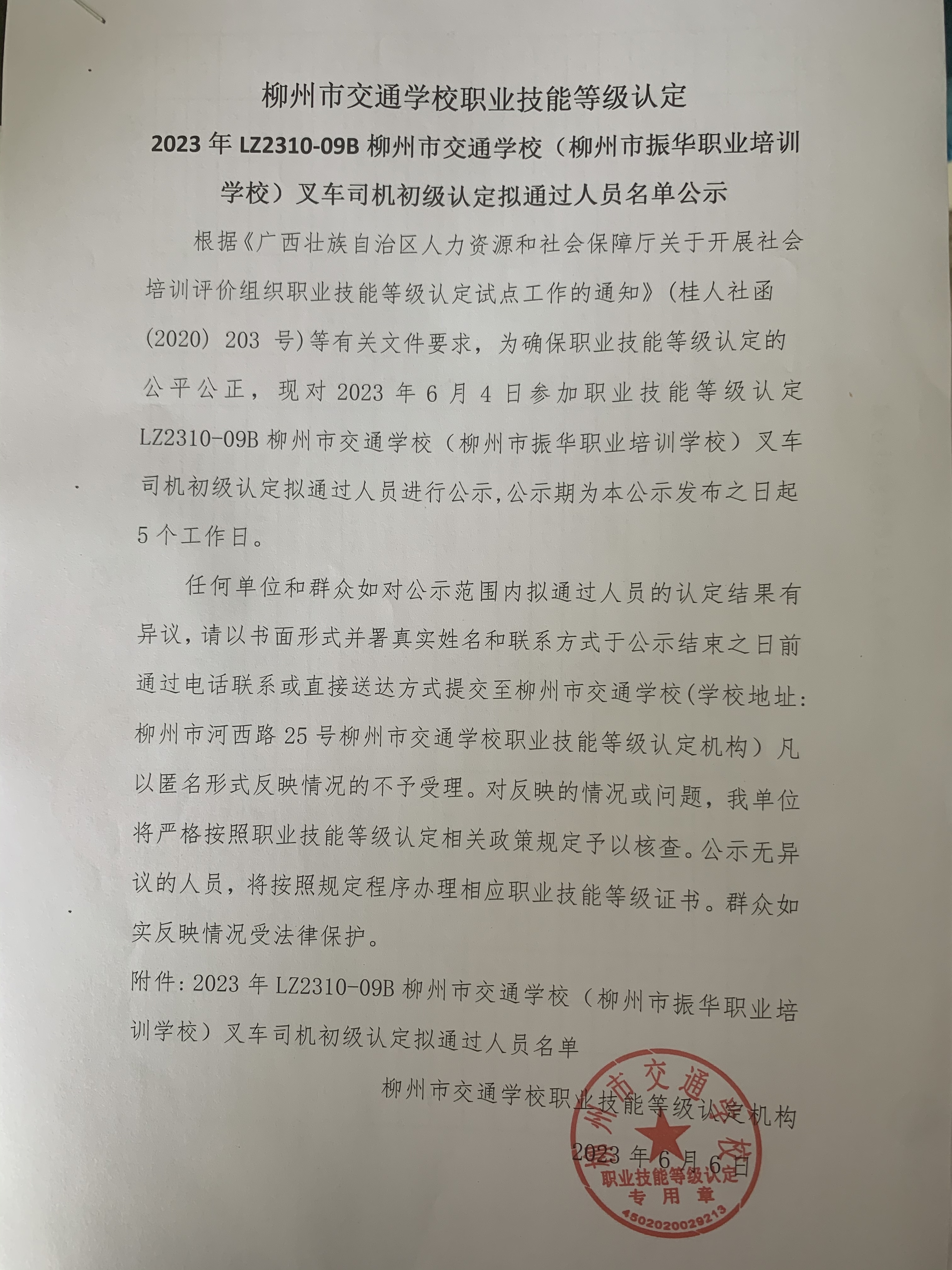 柳州市交通学校职业技能等级认定 2023年LZ2310-09B柳州市交通学校(柳州市振华职业培训学校)叉车司机初级认定拟通过人员名单公示