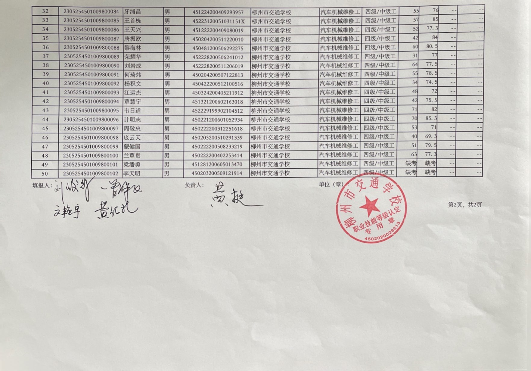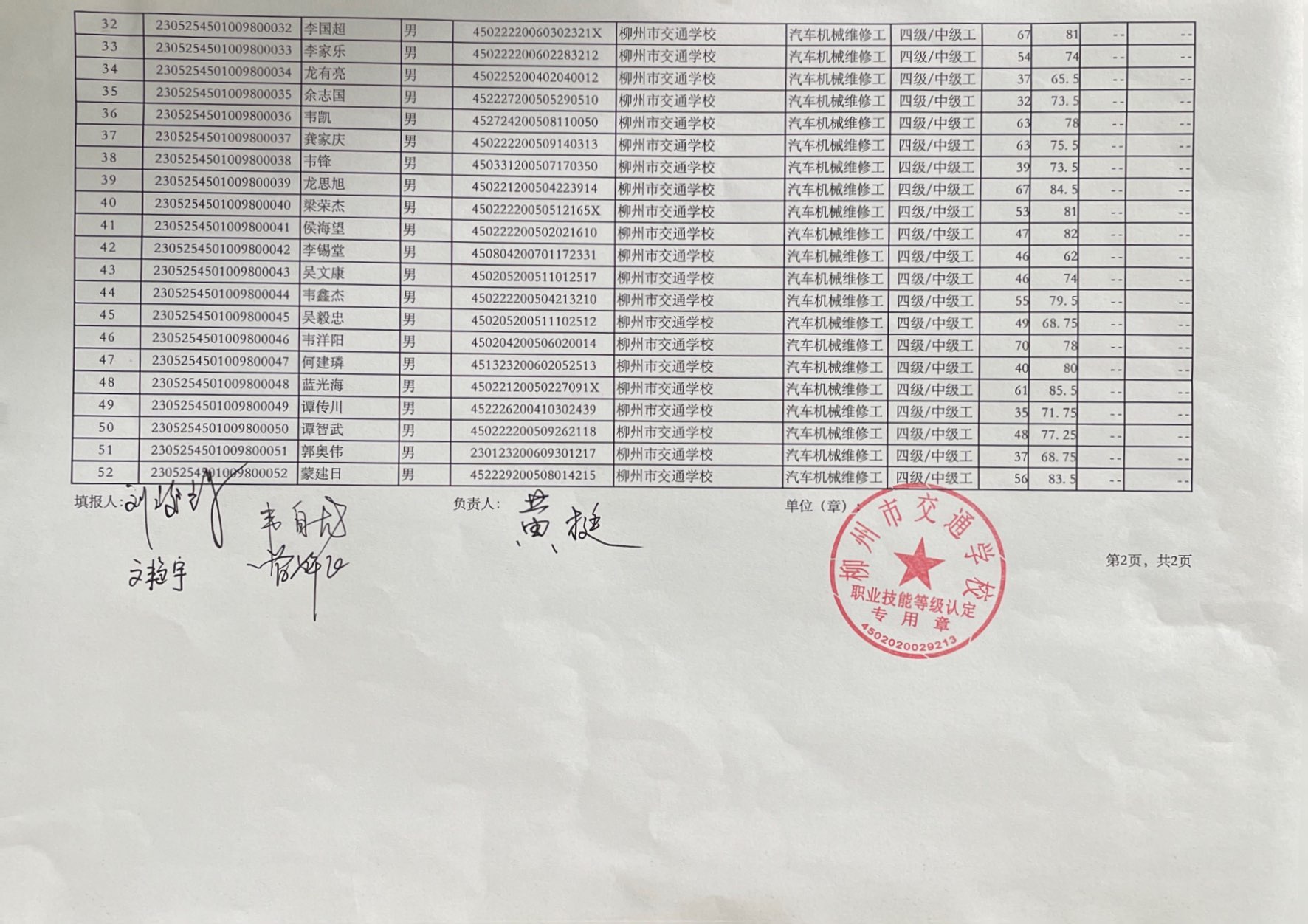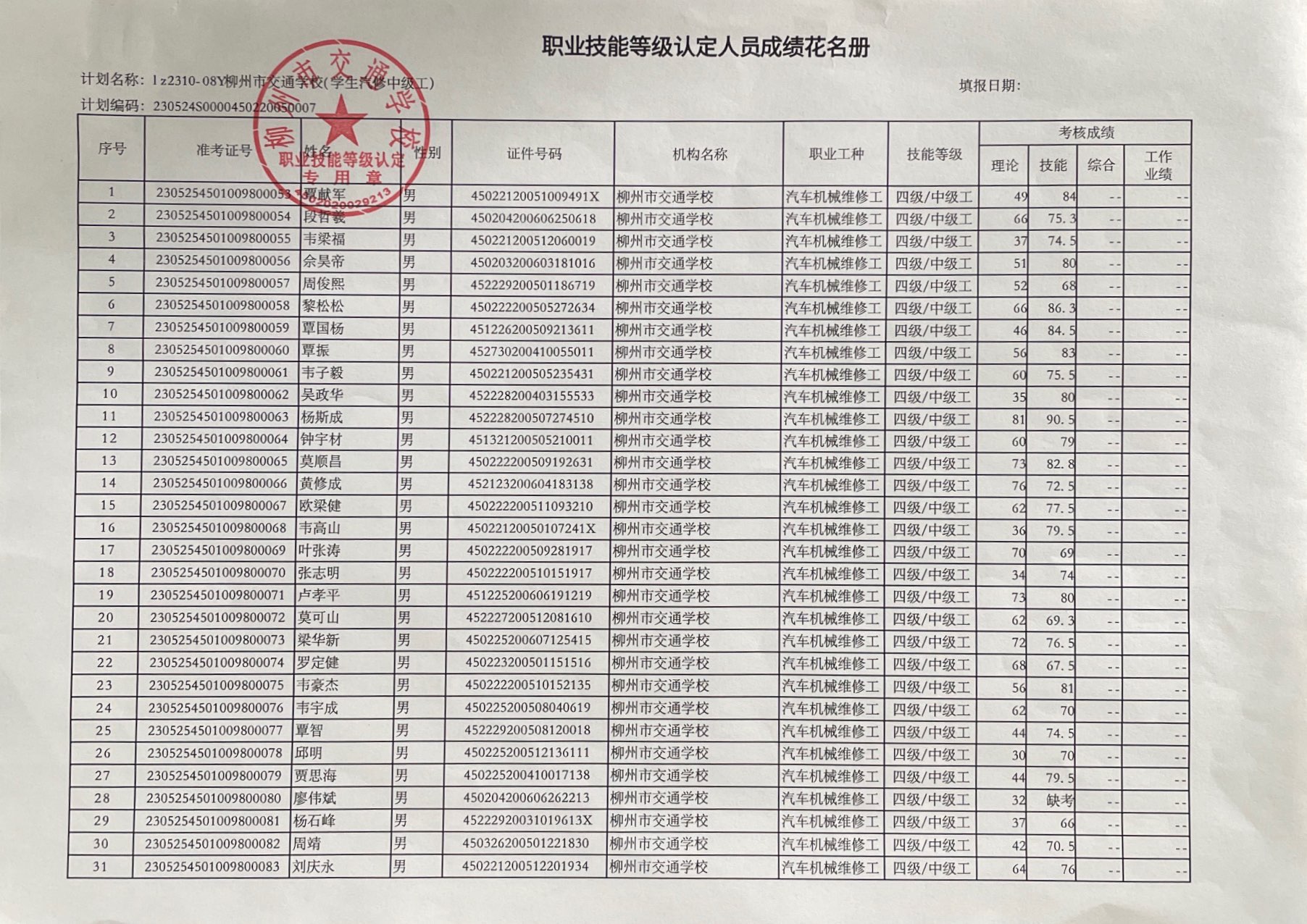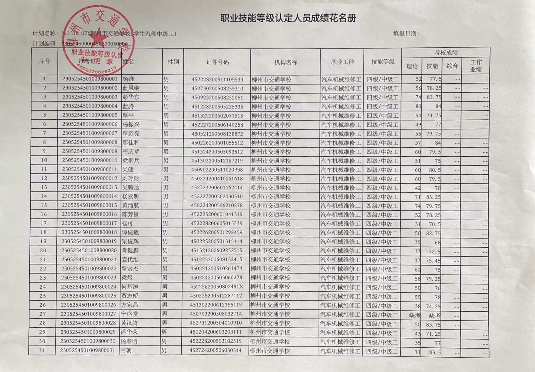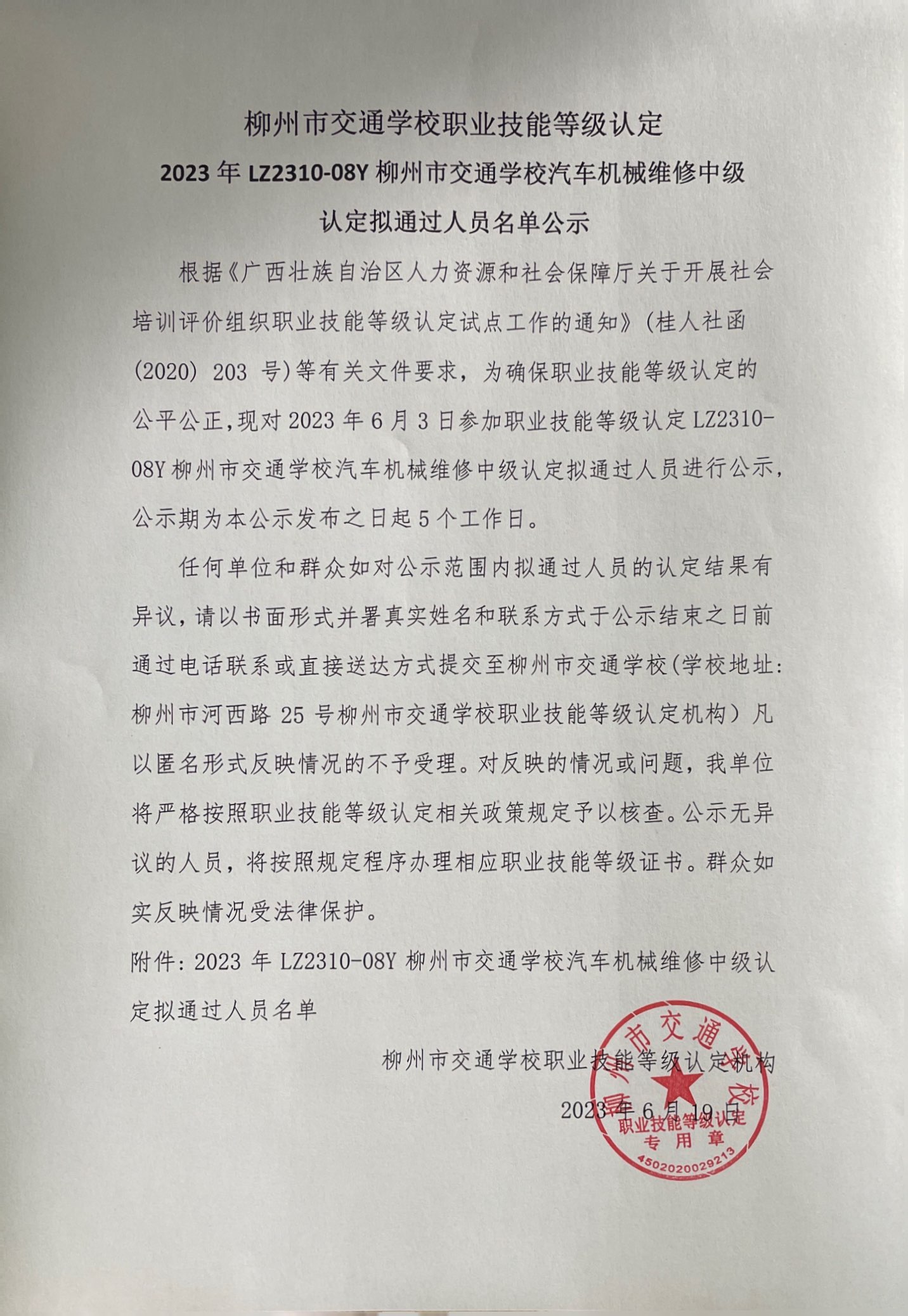 柳州市交通学校职业技能等级认定 2023年LZ2310-07Y、LZ2310-08Y柳州市交通学校汽车机械维修中级 认定拟通过人员名单公示