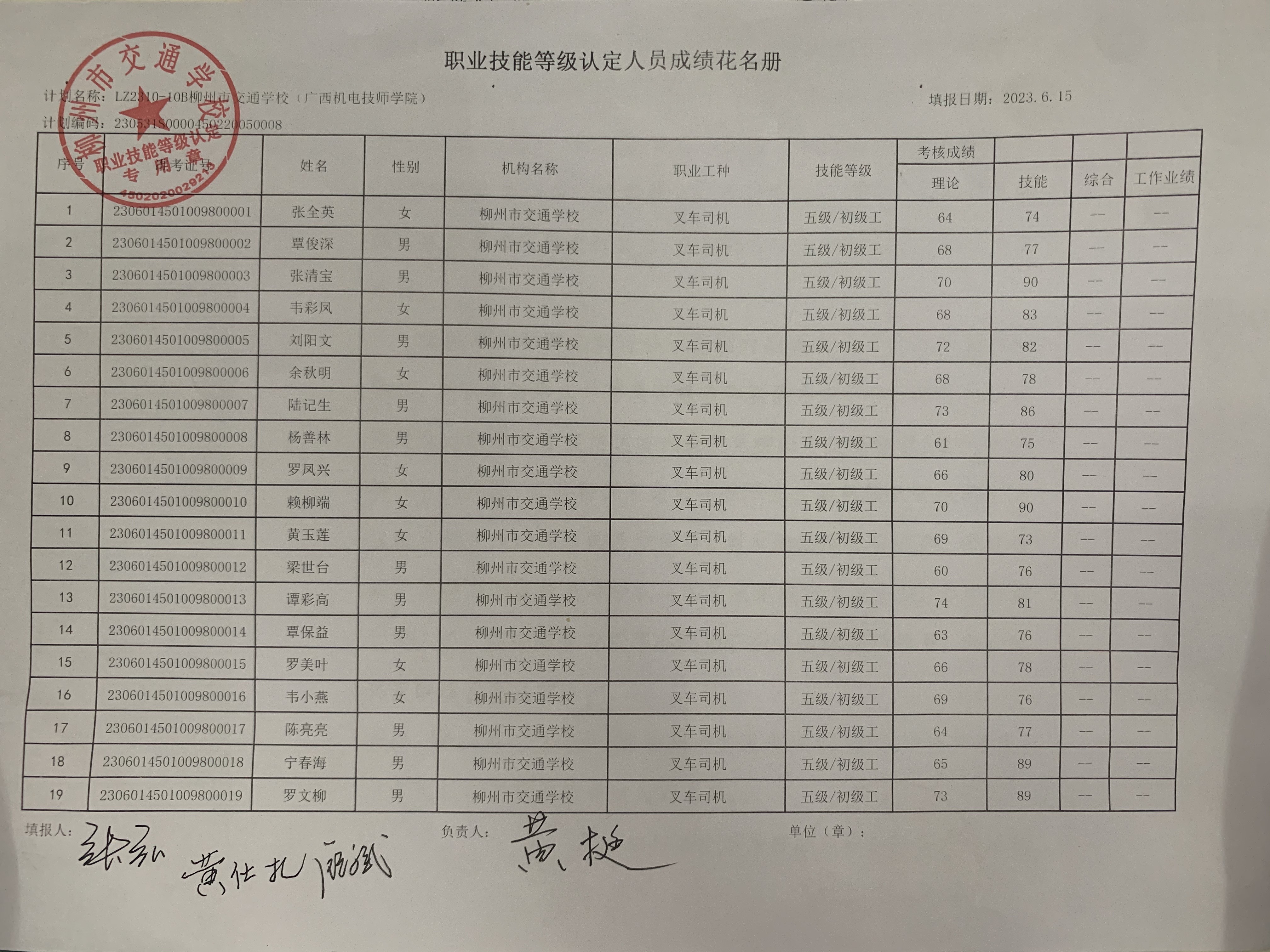 柳州市交通学校职业技能等级认定 2023年LZ2310-10B柳州市交通学校(广西机电技师学院)叉车司机初级认定拟通过人员名单公示