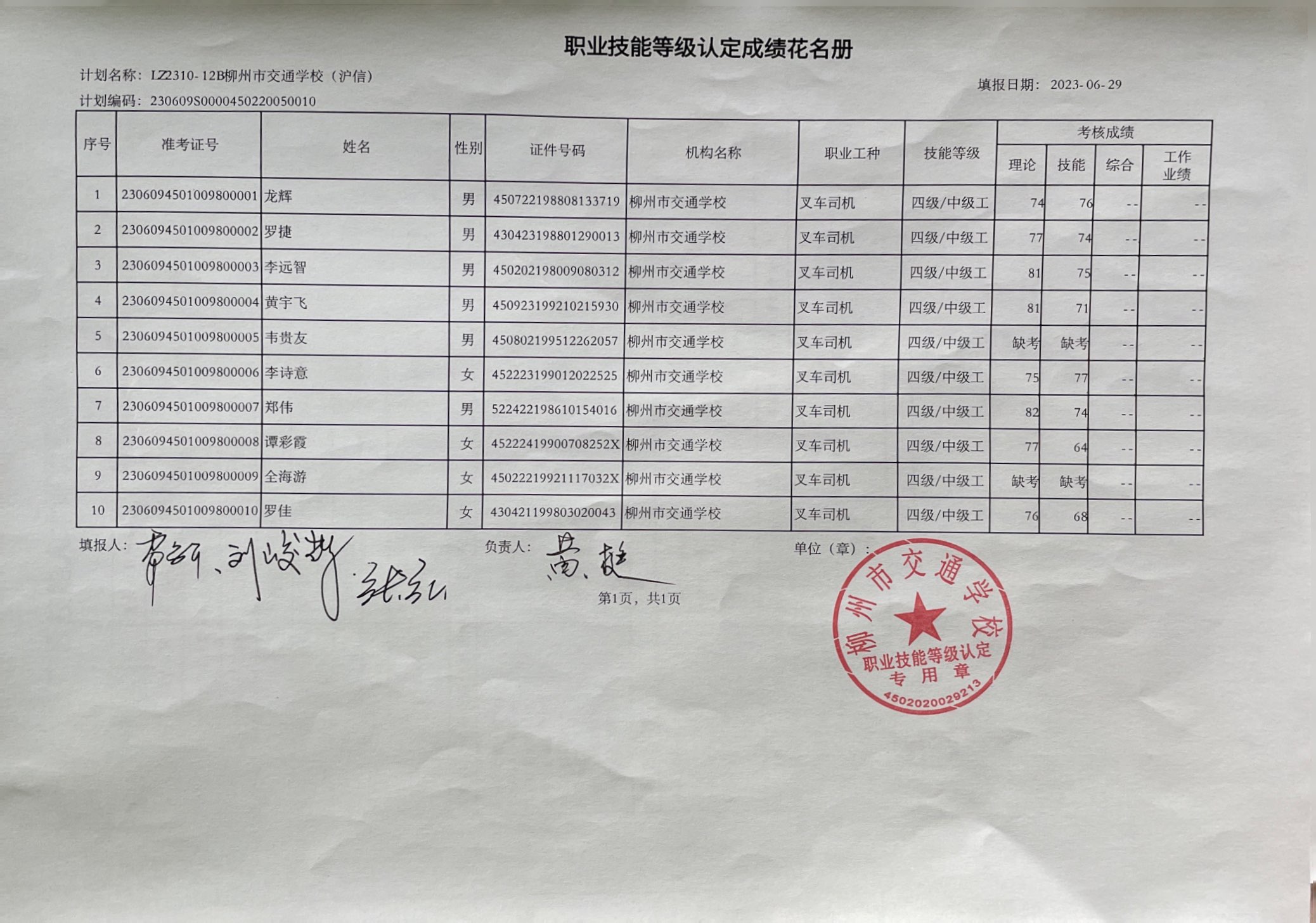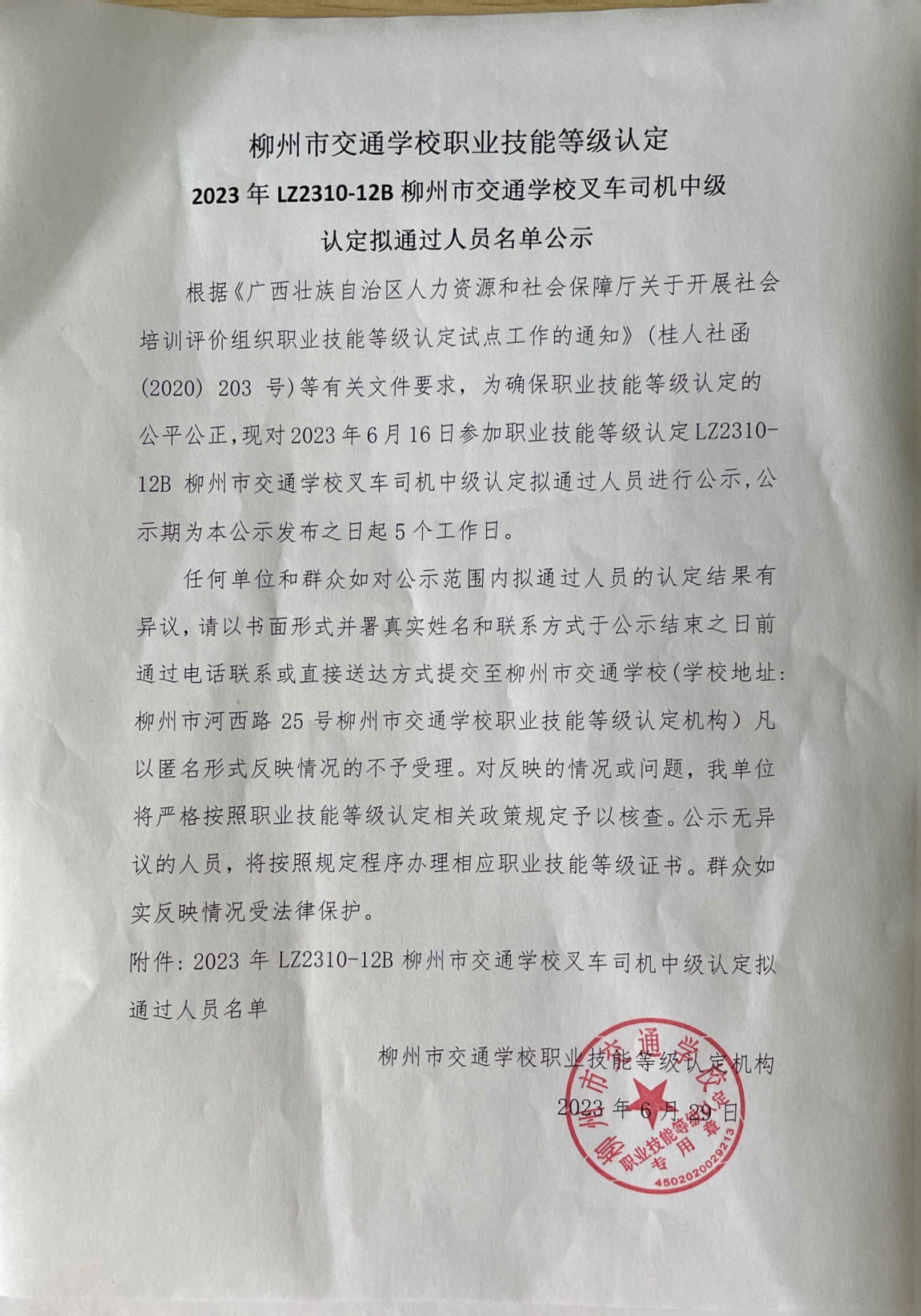 柳州市交通学校职业技能等级认定 2023年LZ2310-12B柳州市交通学校叉车司机中级 认定拟通过人员名单公示