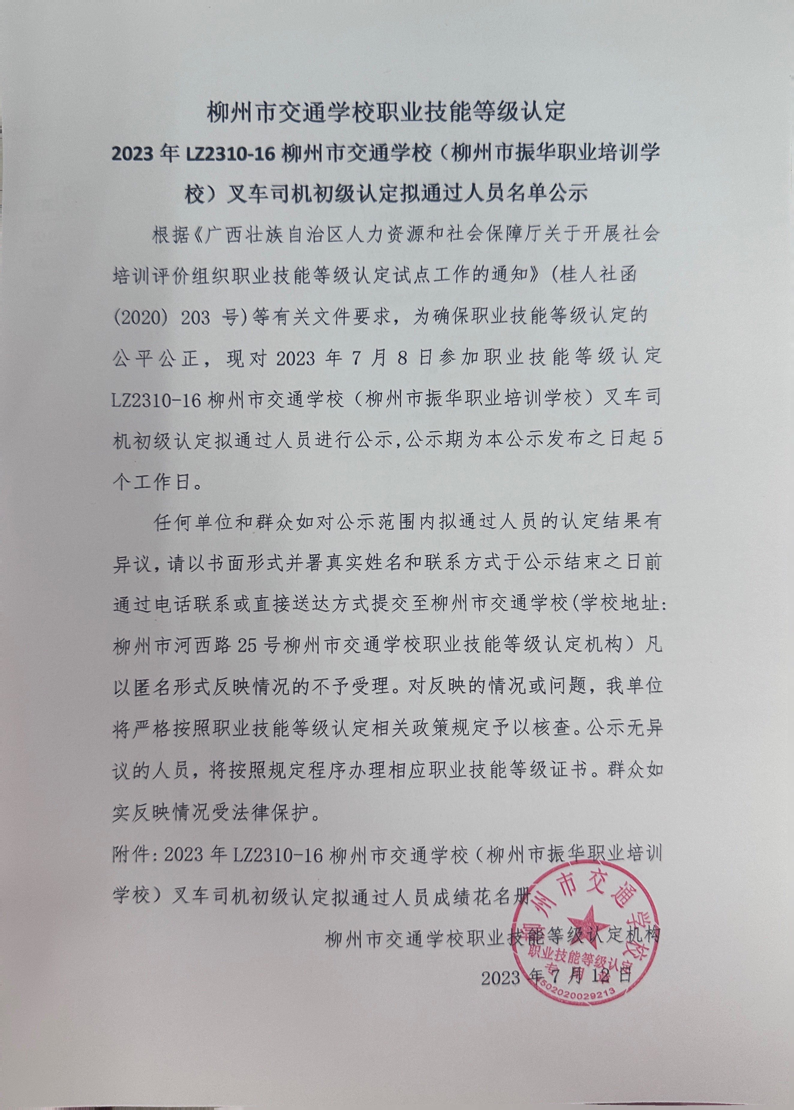 柳州市交通学校职业技能等级认定 2023年LZ2310-16柳州市交通学校(柳州市振华职业培训学校)职业技能等级认定人员成绩公示