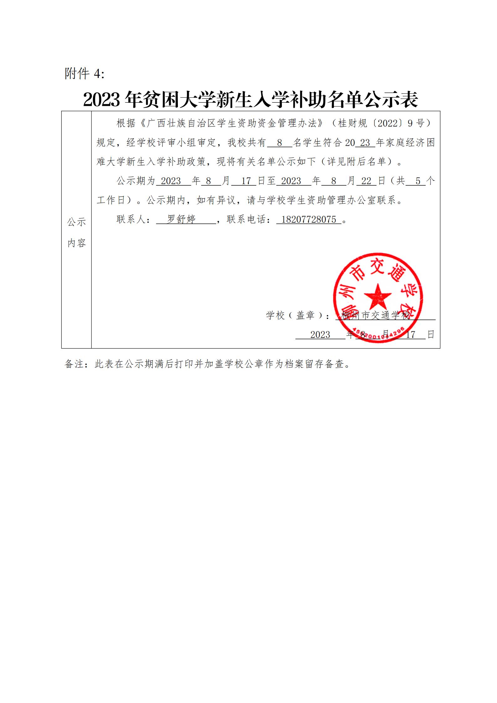柳州市交通学校2023 年贫困大学新生入学补助名单公示情况
