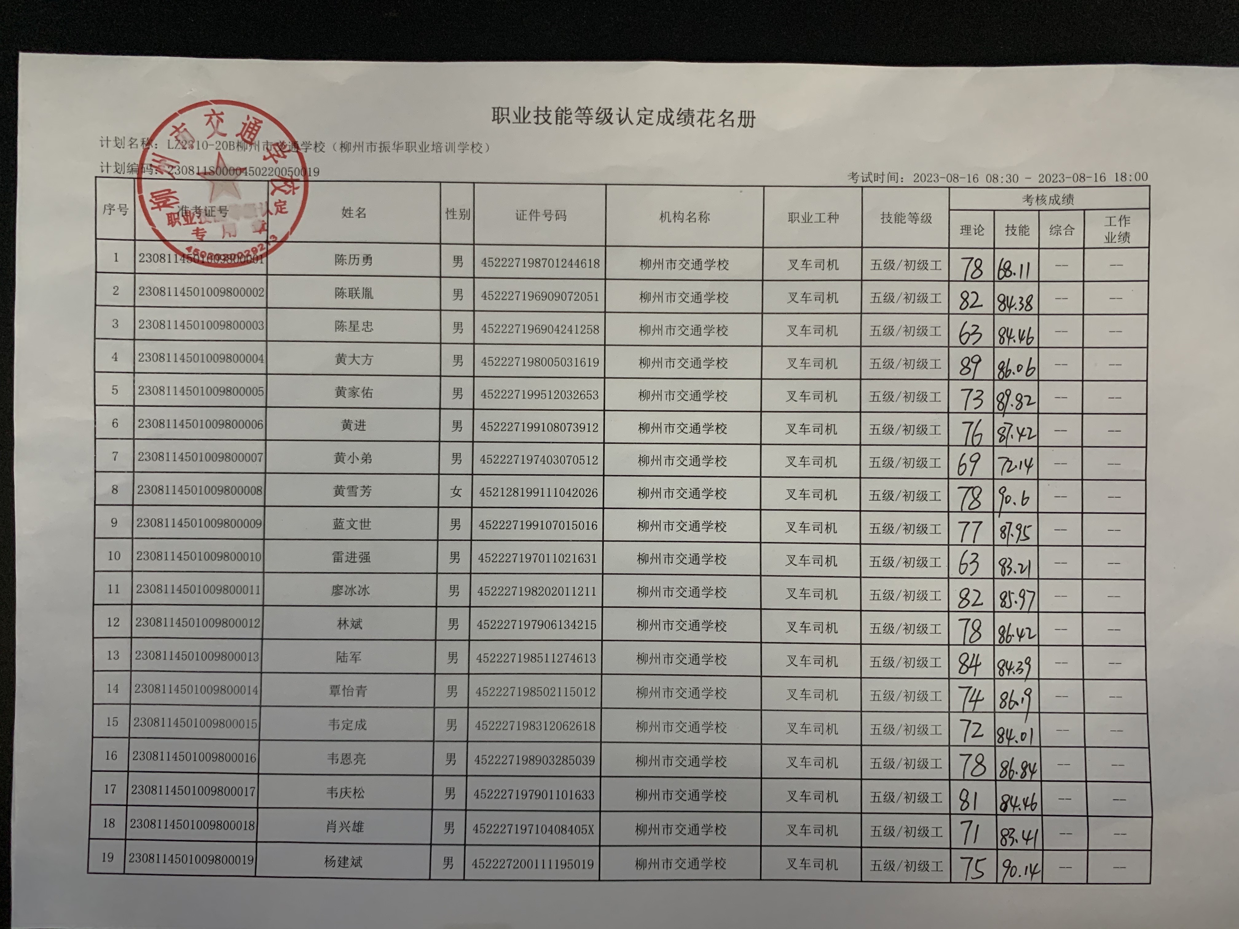 柳州市交通学校职业技能等级认定 2023年LZ2310-20B柳州市交通学校(柳州市振华职业培训学校)职业技能等级认定人员成绩公示