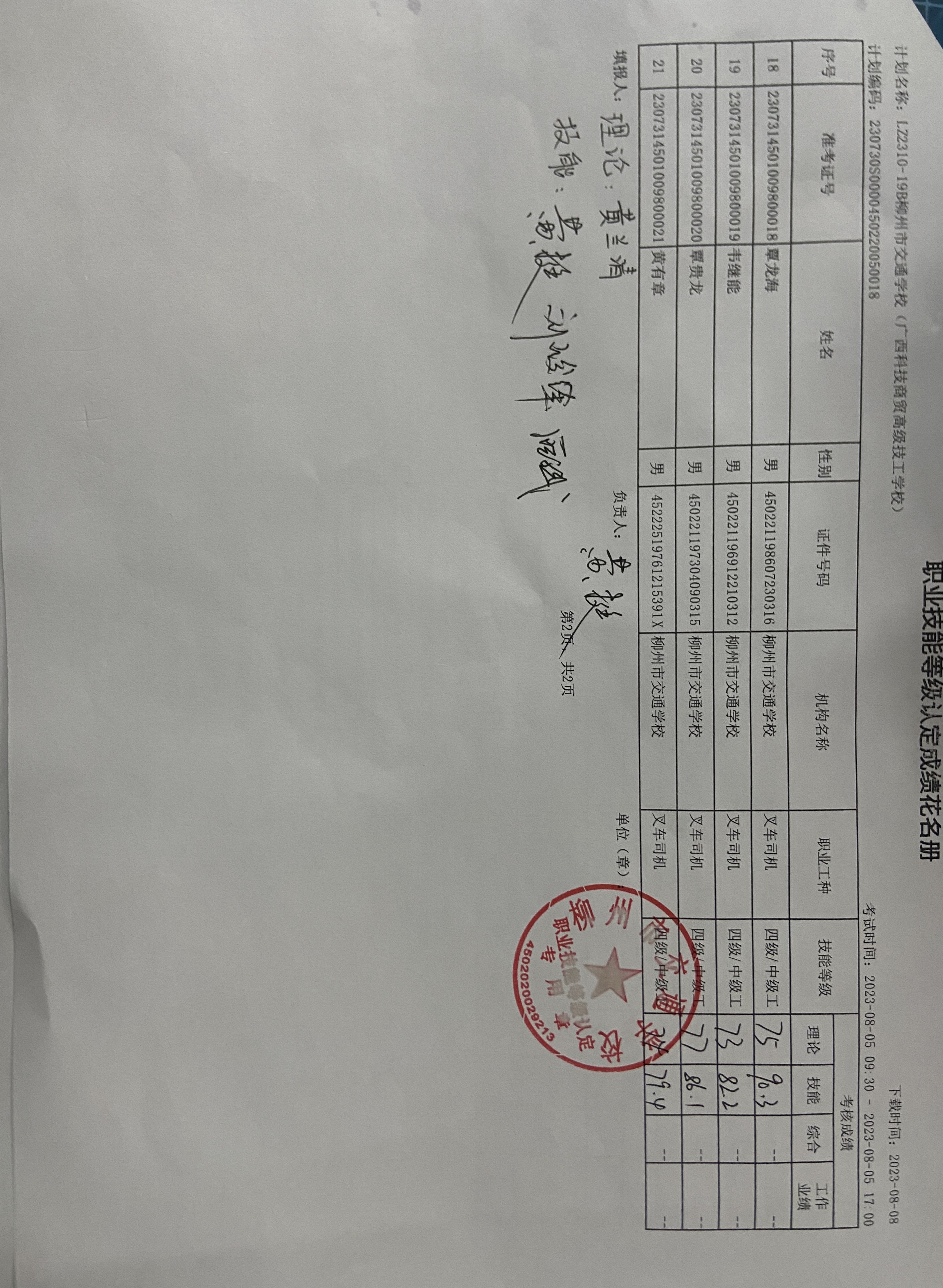 柳州市交通学校职业技能等级认定 2023年LZ2310-19B柳州市交通学校(广西科技商贸高级技工学校)职业技能等级认定人员成绩公示