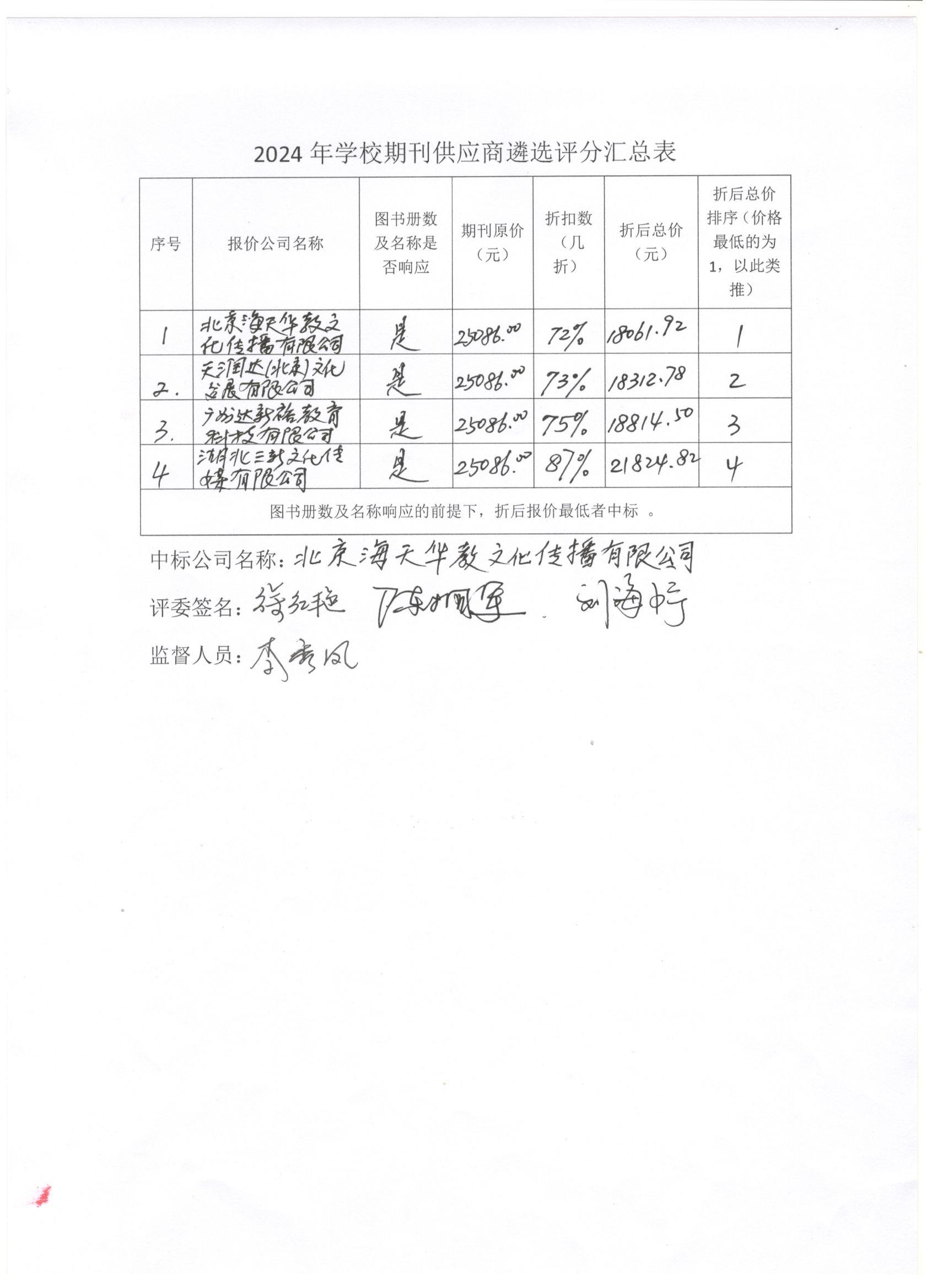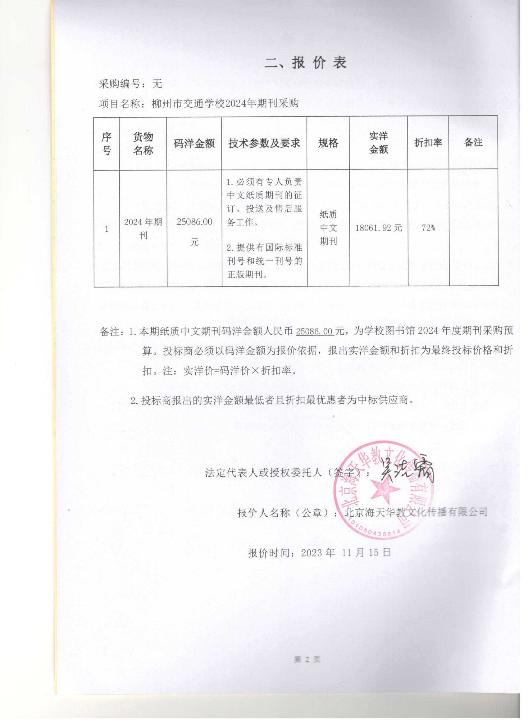 根据学校的相关规定,柳州市交通学校就2024年图书馆期刊供应商进行询价采购,现将本次询价采购结果正式公布如下: